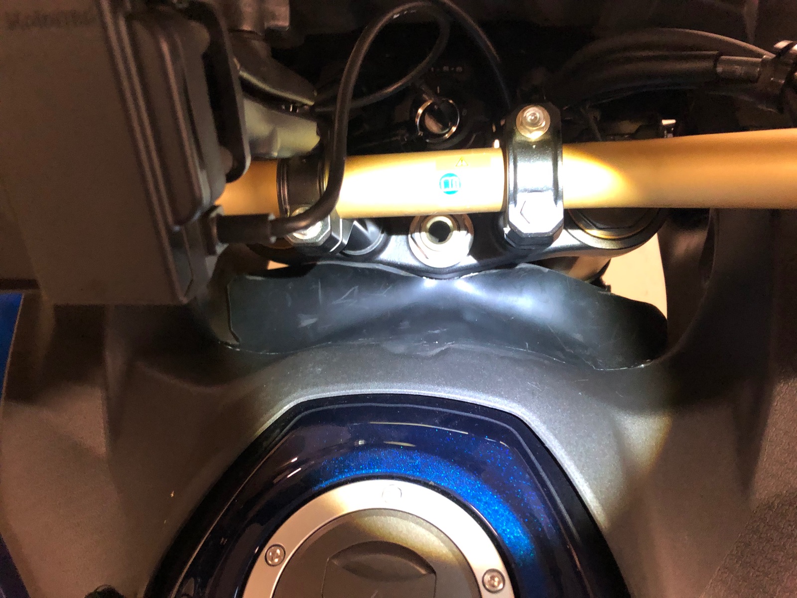 Wenn Du den Tank demontiert hast, kannst Du die Matte ja auch anders einbauen. Ich habe nur die beiden oberen Schrauben der Kunststoffverkleidung gelöst und die beiden Kunststoffstöpsel auch. Dann die Matte dazwischen geschoben, Kunststoffstöpsel rein gedrückt und die beiden Schrauben festgezogen. Das wars.