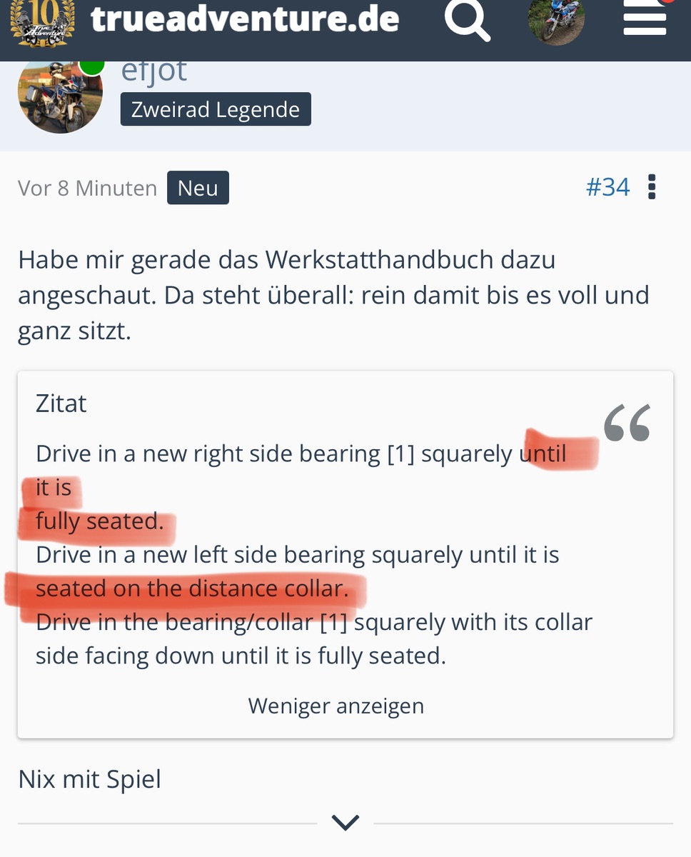 Alex80.2 vielen Dank für den Tipp mit dem Innenring und der Distanzhülse. Im Werkstatthandbuch wird auf diesen Umstand nicht extra hingewiesen, da man ja laut WHB das Honda Werkzeug benutzt, bei dem das Lager automatisch am Innen- und Außenring gepresst wird. Ich nehme an, dass das gerade das Missverständnis ist. Für mich war der Tipp auf alle Fälle sehr wertvoll. Ich werde mir einen Satz mit Lagereintreibern kaufen, wo es Scheiben für alle möglichen Lagergrößen gibt. Diese Scheiben sind einfach immer massiv, sodass automatisch am innen- und Außenring gepresst wird (sofern nicht die Lager Innen und außen unterschiedlich breit sind, aber das wäre höchst untypisch).