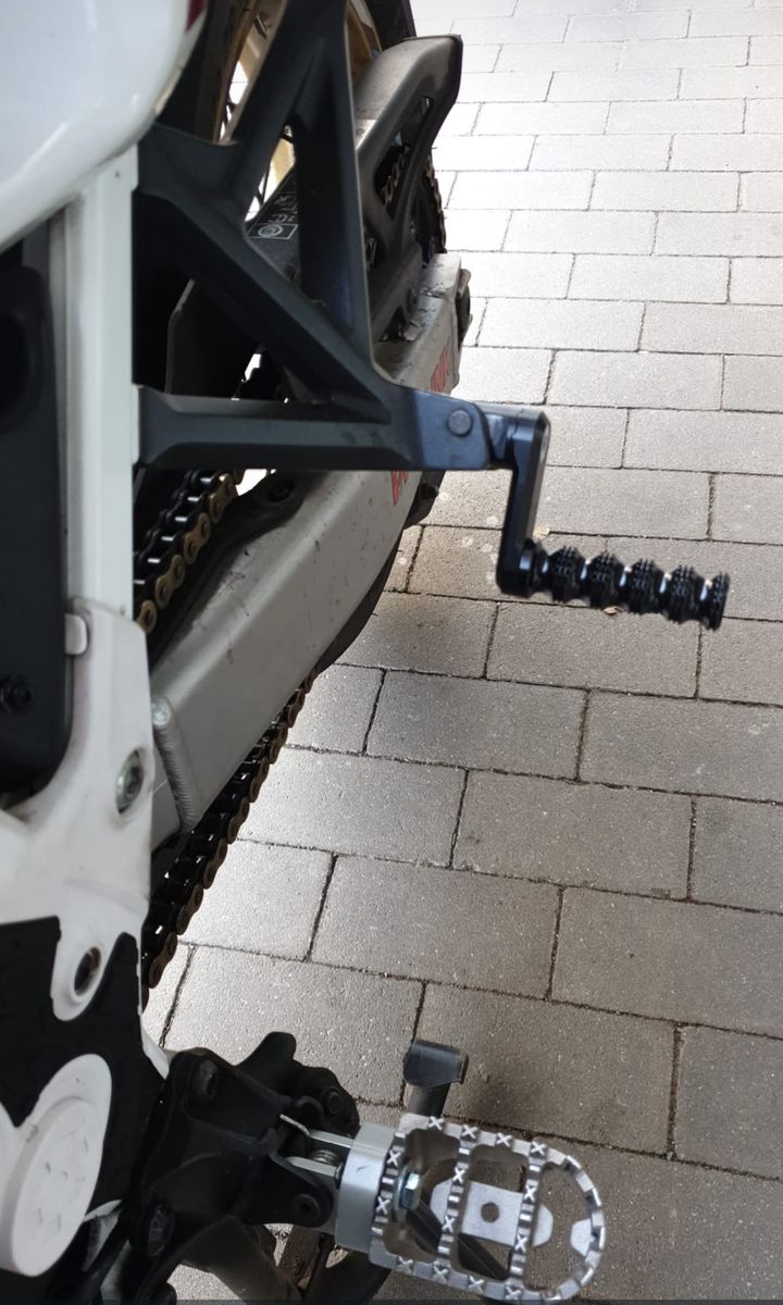 Hier mal meine, die haben aber 50mm-Ausleger.Waren dann diagonal nach vorn und unten eingestellt. Hatte erst Bedenken, daß es zu eng zu meinen Beinen wird wenn ich die Füße im Stand unten habe, aber ich hatte damit keine Probleme