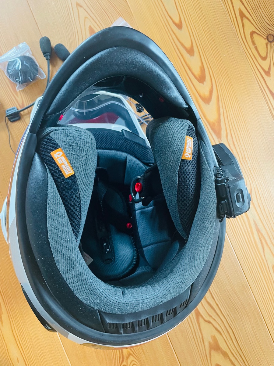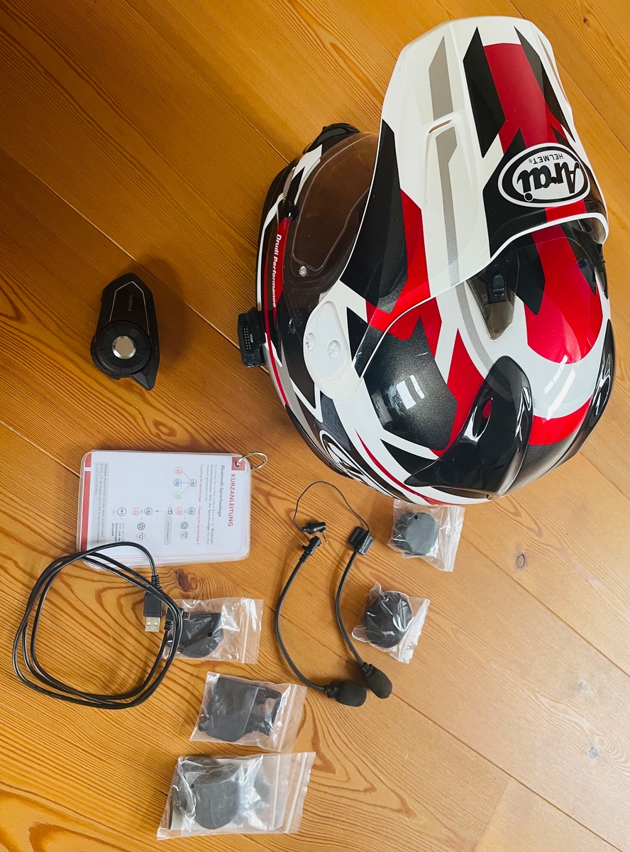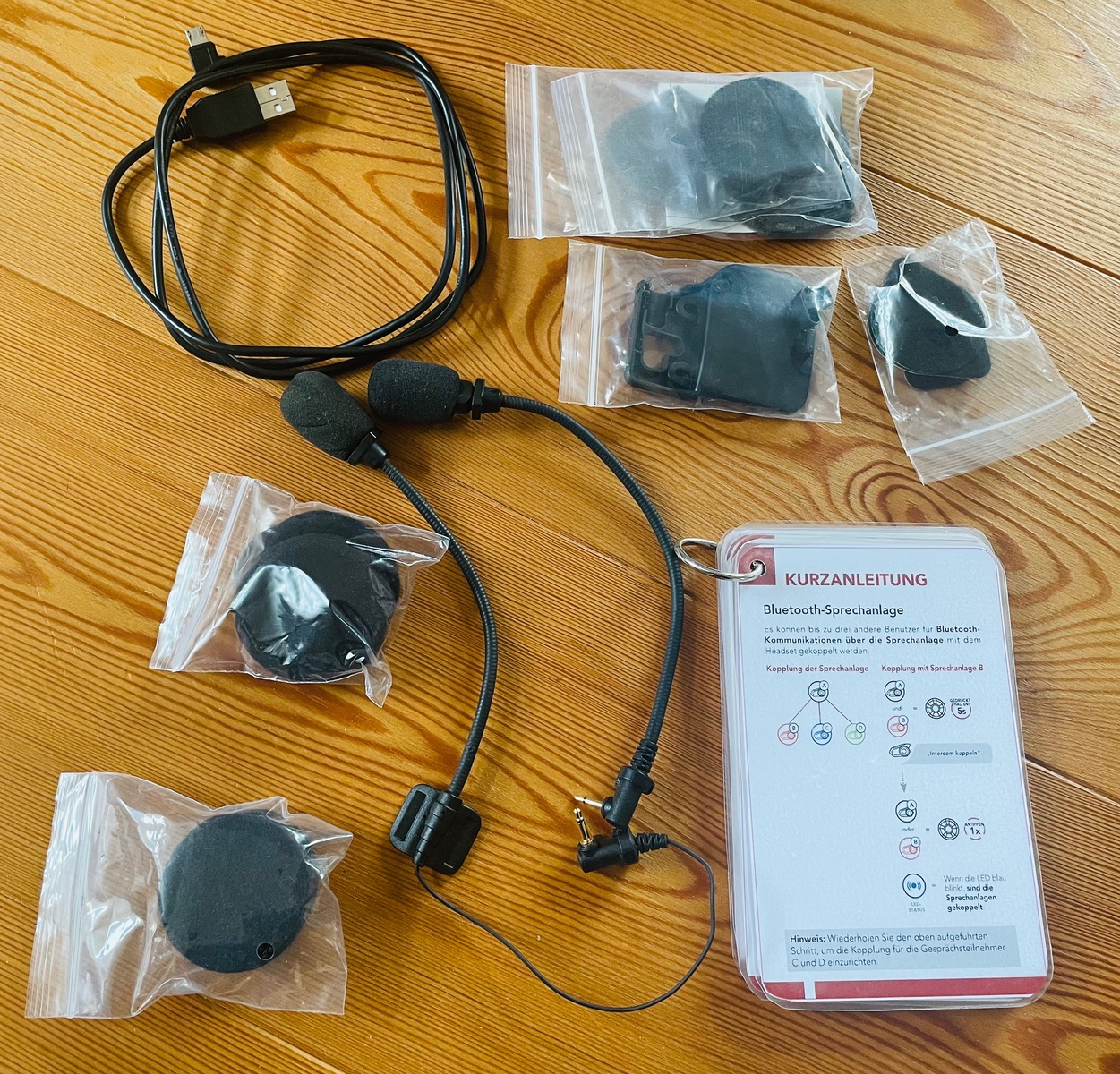Lieferumfang: Helm inkl. Aufbewahrungsbeutel, Sena 30K inkl. Schwanenhalsmikros und weiterem Zubehör. Verbaut ist das Flachmikro inkl. Lautsprecher. Visier ist inkl. Pinlock