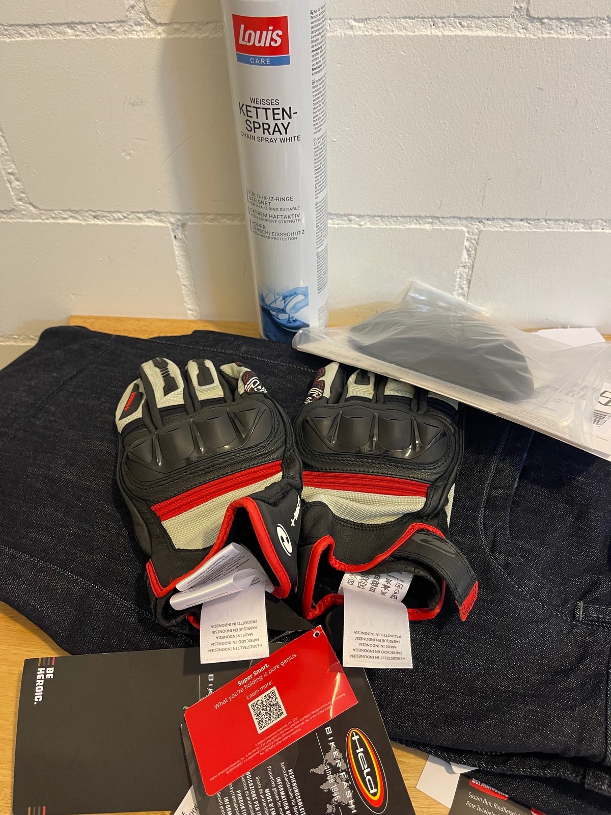 Kettenspray 16.99 😊 und Jeanshosen mit Protektoren und Handschuhe 😁