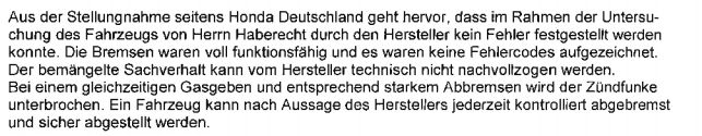 Bisher war ich davon ausgegangen, daß die Ursache darin lag, dass der Gasgriff, der durch eine Handbewegung beim Betätigen des Bremshebels ausgelöst werden kann, nicht von dem vorderen Bremshebel entkoppelt ist. Zieht man den Bremshebel könnte es sein, dass der Daumen nach unten rutscht und dadurch gas gibt (Was nicht möglich sein soll, laut Honda, das starke Bremsen würde sofort den Zündfunken unterbrechen).
