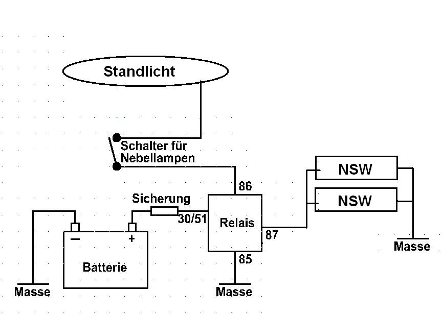 So sieht ein Standartanschluss für Zusatzscheinwerfer aus. Die Nummern in dem Bild müssten auch an den Pins von Deinem Relais stehen, ist alles genormt.