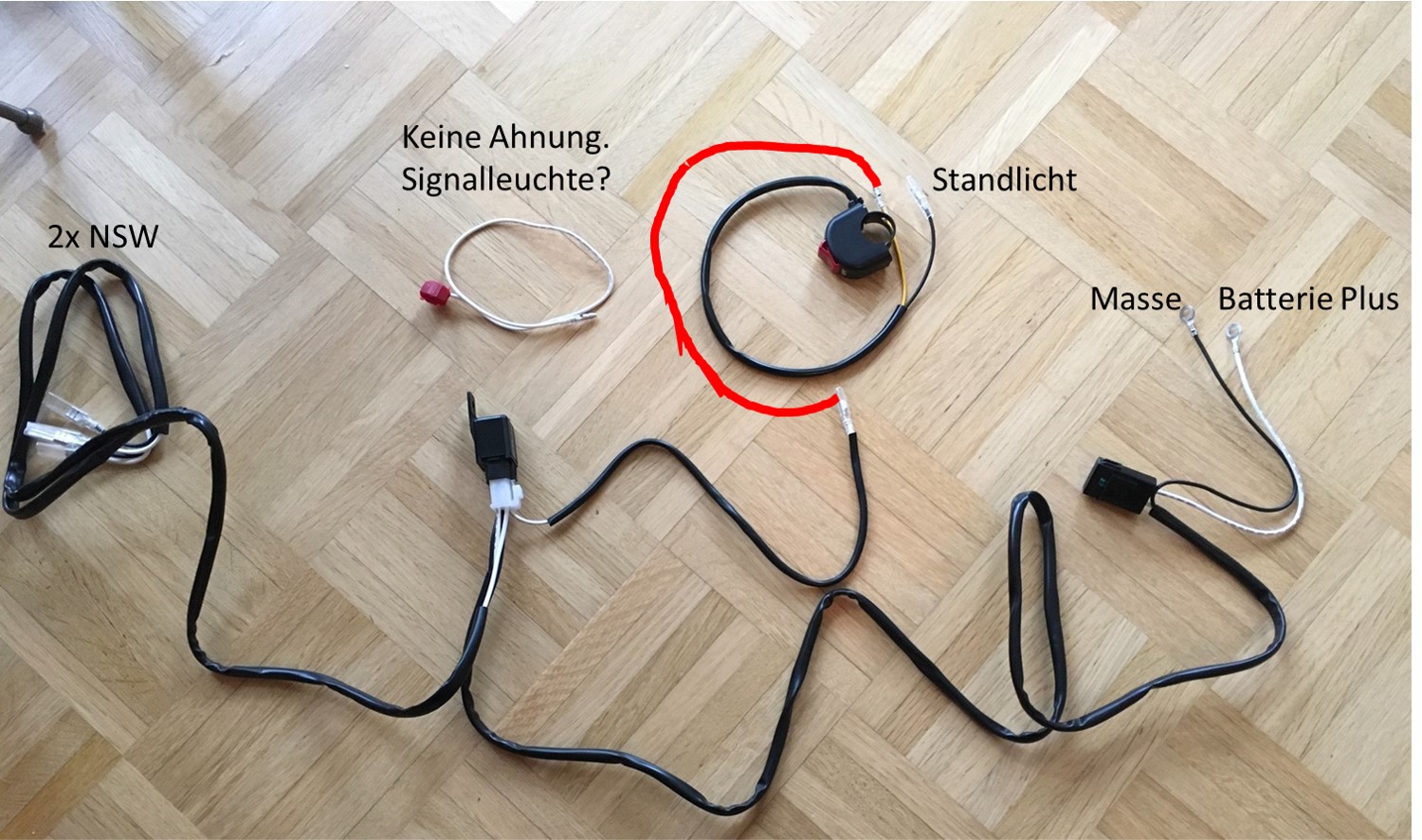Das weiße Kabel geht dann an das schwarze Kabel vom Schalter, der rote "Stromdieb" an das Standlichtkabel (Plus)