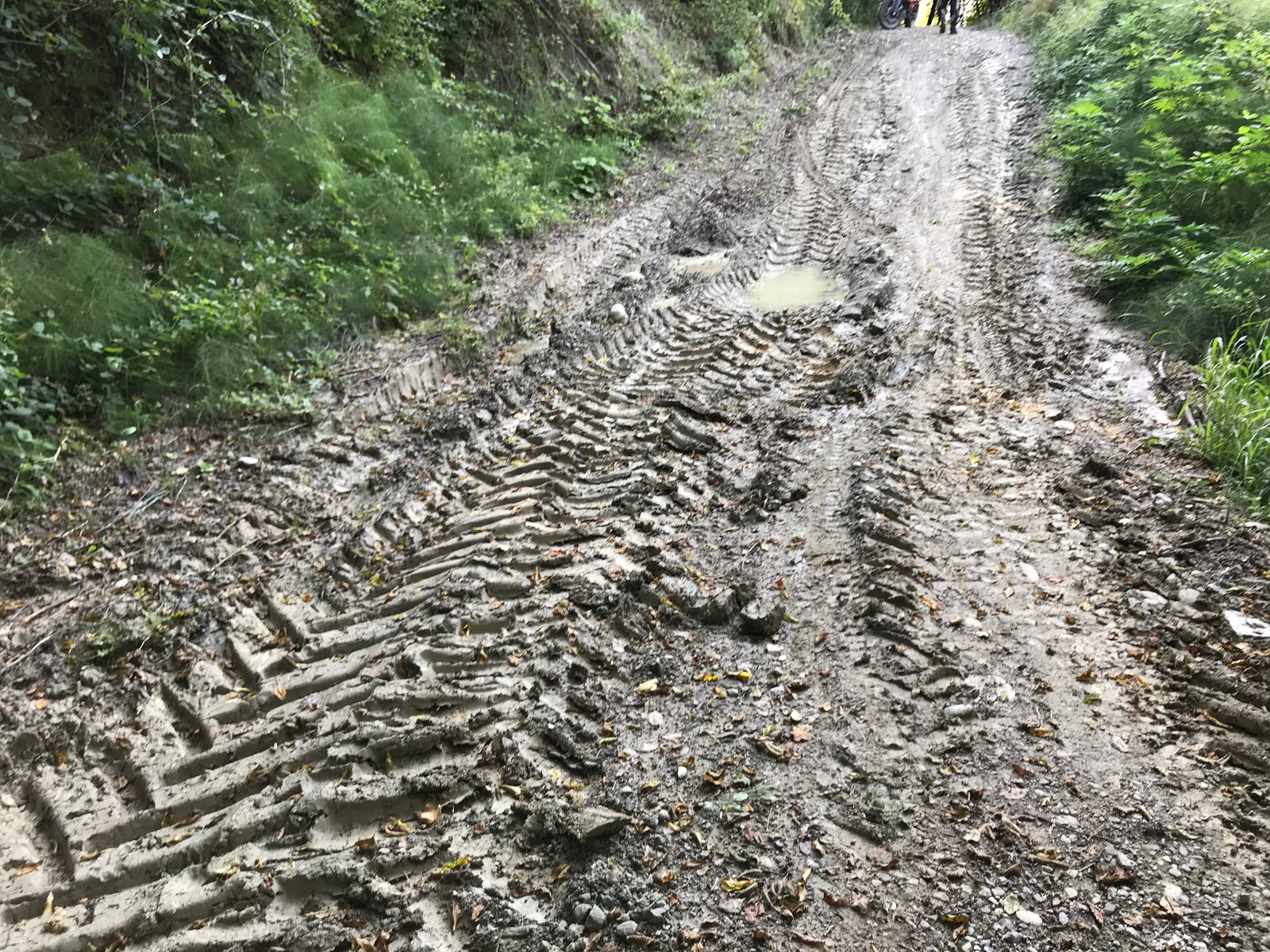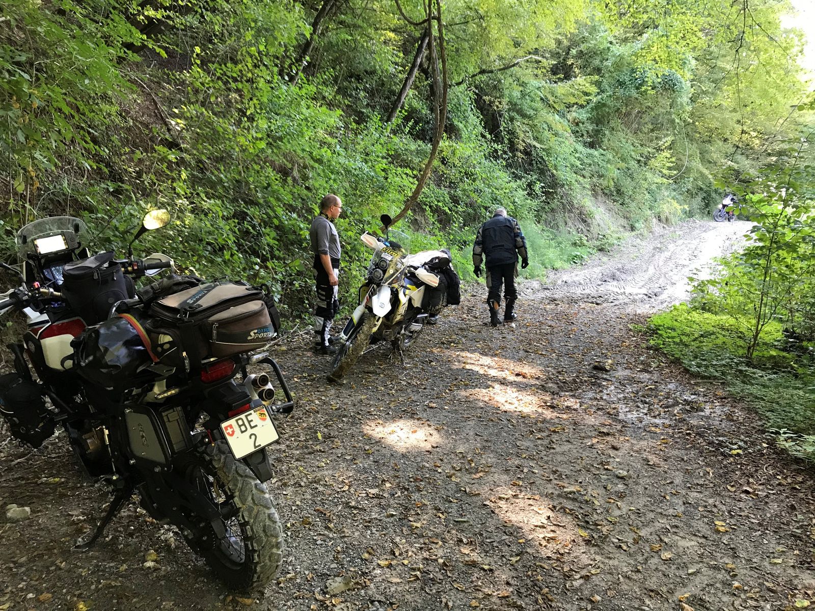 Das war eine recht heikle Passage mit Lehm: auf dem Bild geht's recht den Hang runter, ausrutschen wäre fatal. Links ist's aber tiefer. Ich habe mich für rechts entschieden, ging alles OK. Kollege mit der Husky für links, ist in der Mitte der Passage gestürzt. Die 1190er KTM mit dem K70 haben wir dann zu dritt und mit Kupplung spielen rübergeschoben: