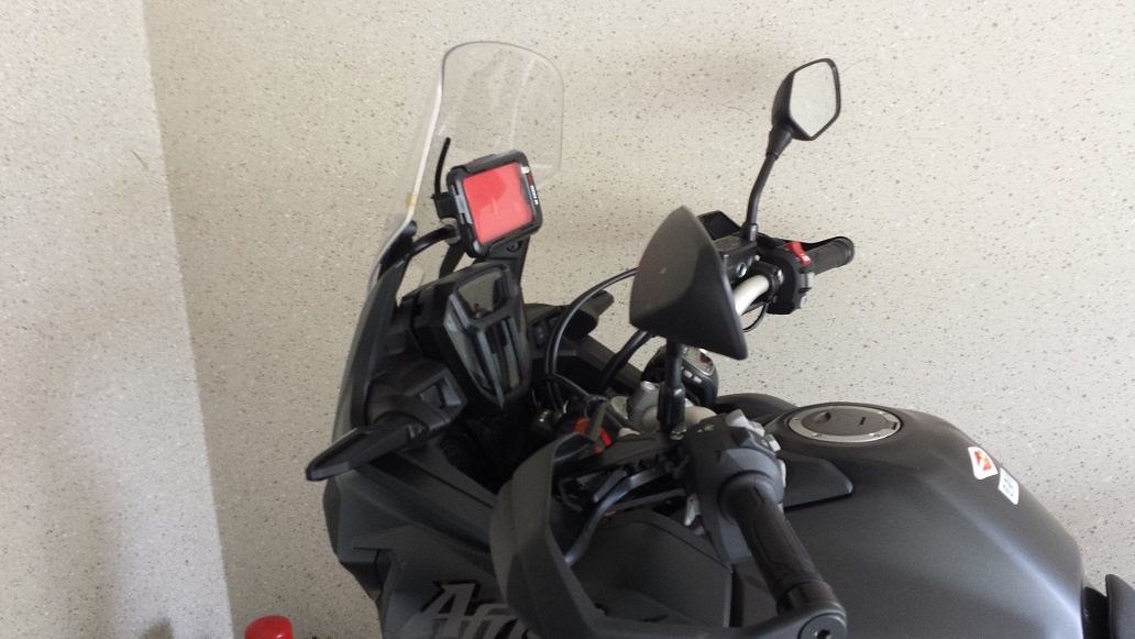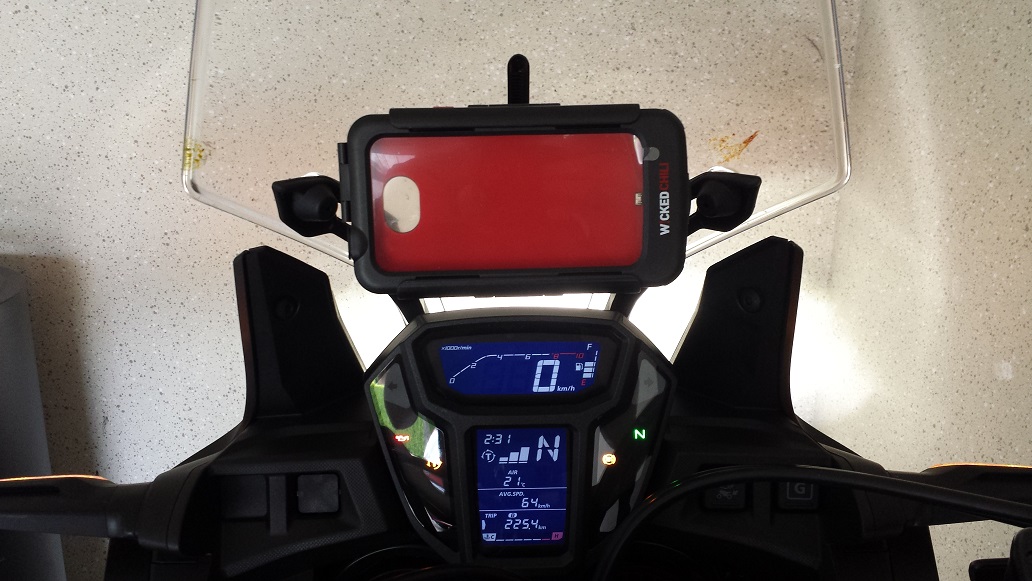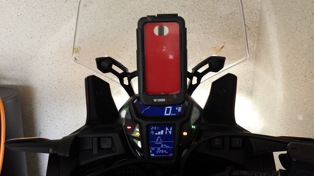 Stromversorgung mittels Micro-Usb von hinten Wasserdicht eingeführt.Kosten: 20€ für den Handyhalter + vorhandenes Galaxy S4 inkl Navisoftware.
