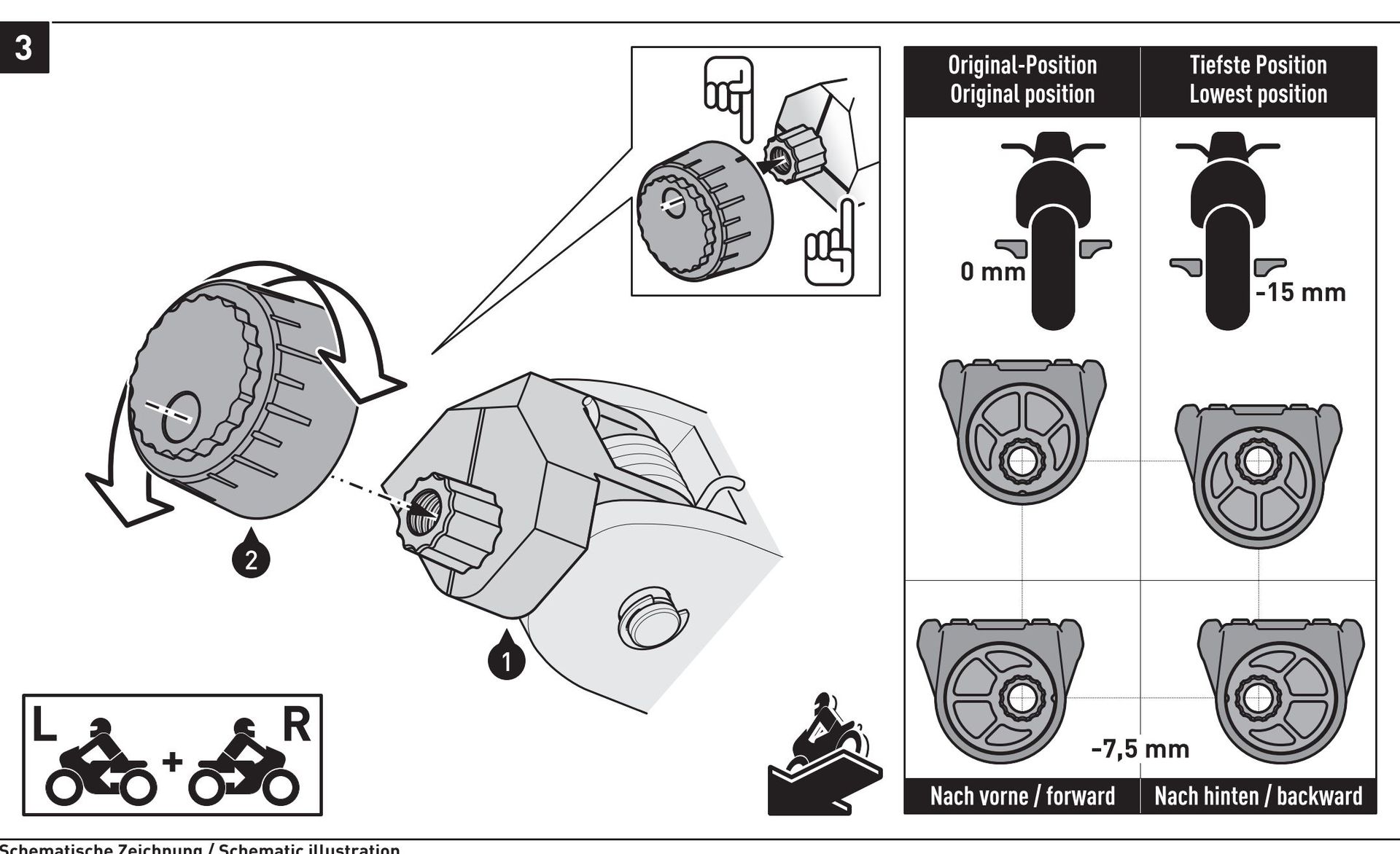 Alles anzeigenAber nicht die Halterung bestimmt doch, ab die Fußraste höher oder tiefer liegt, sondern je nachdem wie du die eigentliche Fußraste über den Positionierungskonus aufsetzt - damit bis zu 15mm tiefer.
