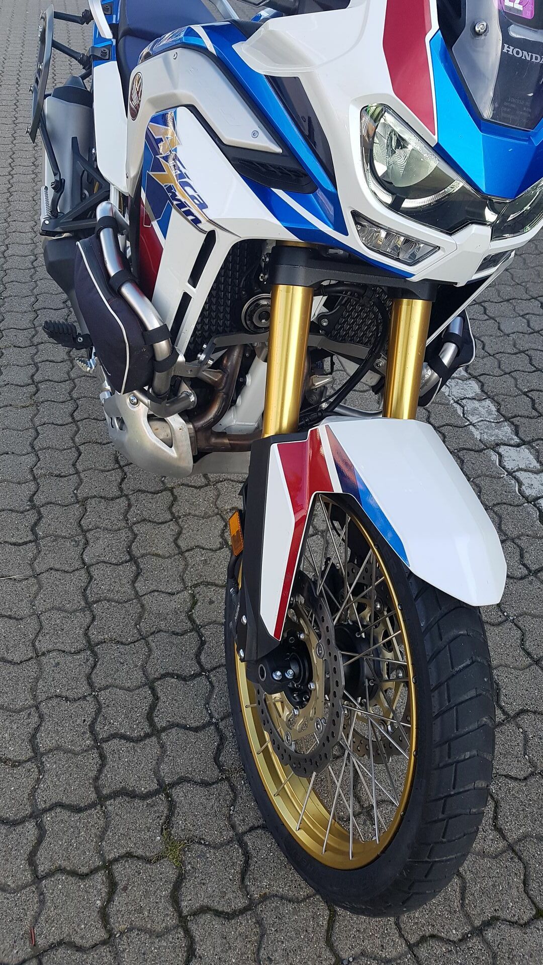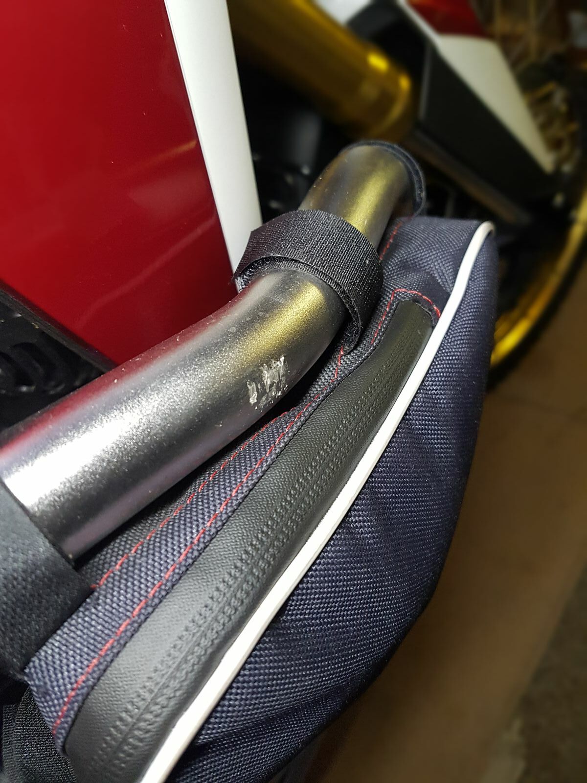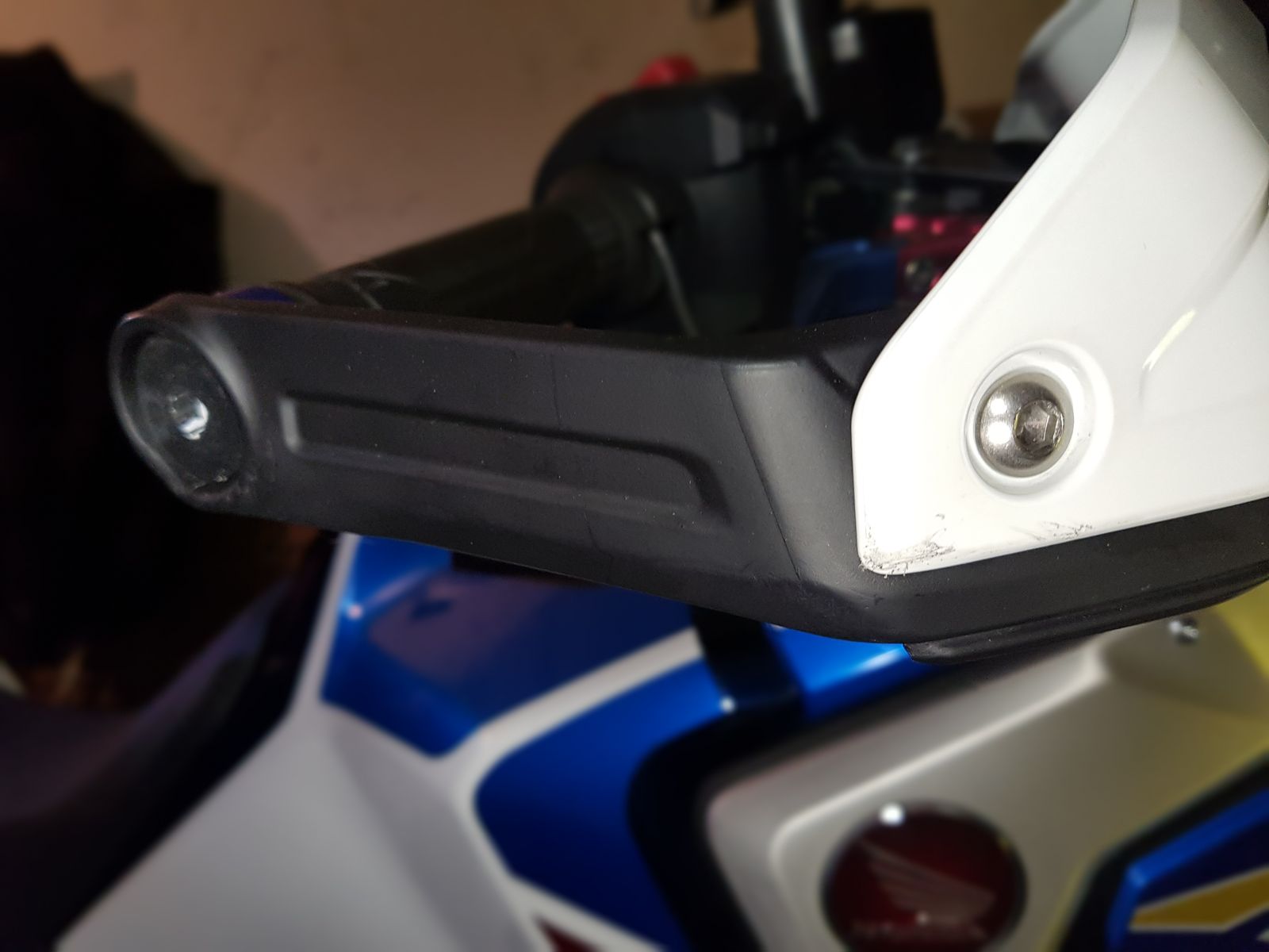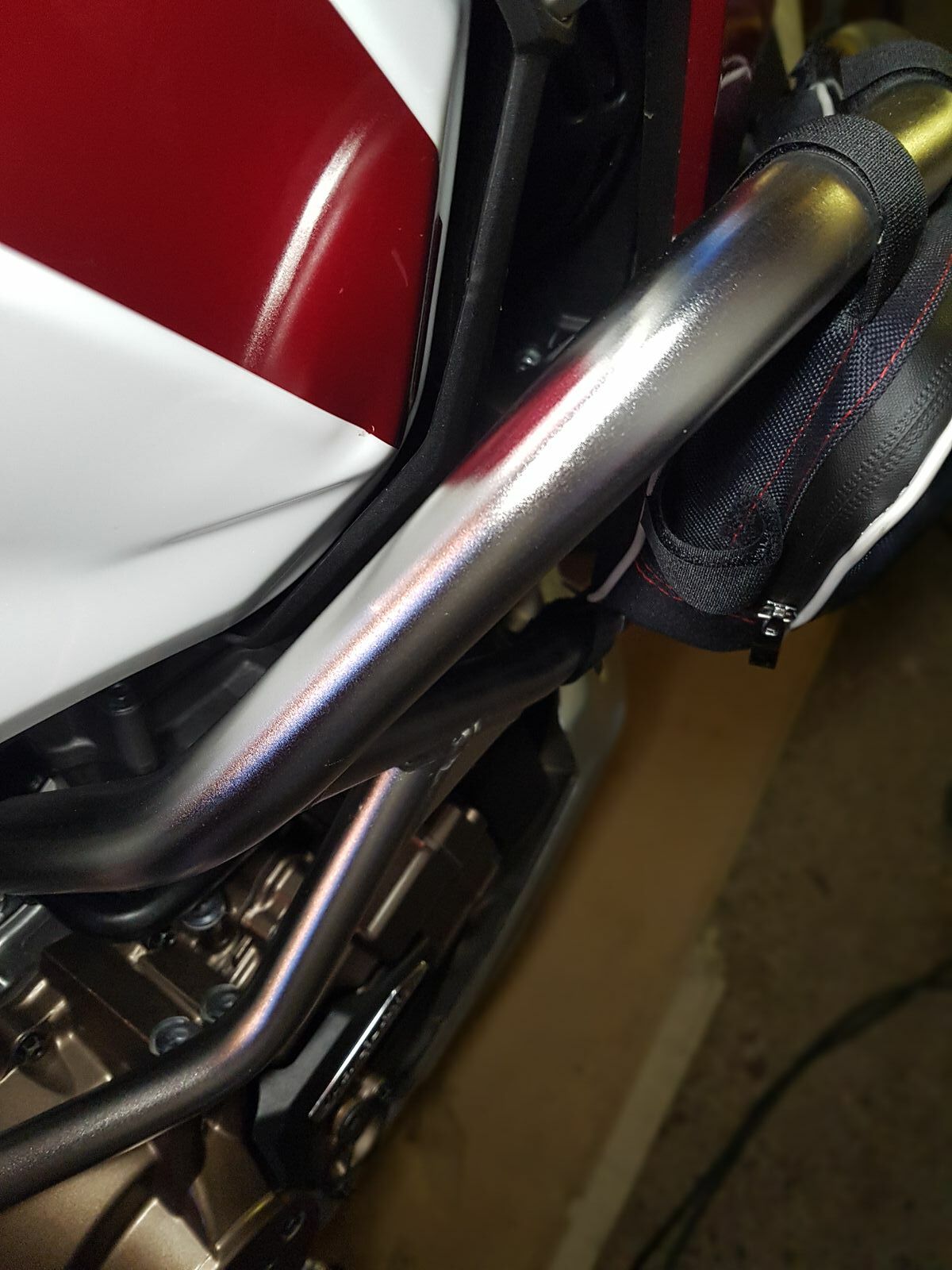Bügel, Handgard und Raste haben Kratzer abbekommen und der Tank eine Beule, was mich am meisten ärgert. Hatte den Bügel spannungsfrei montiert. Es waren 2 cm Platz.
