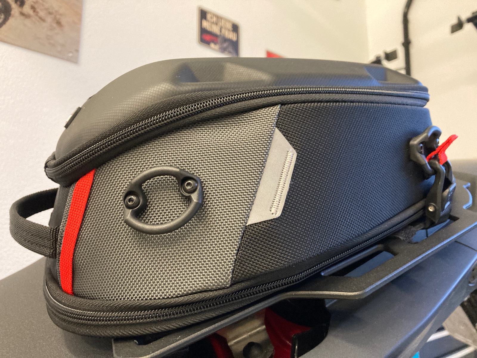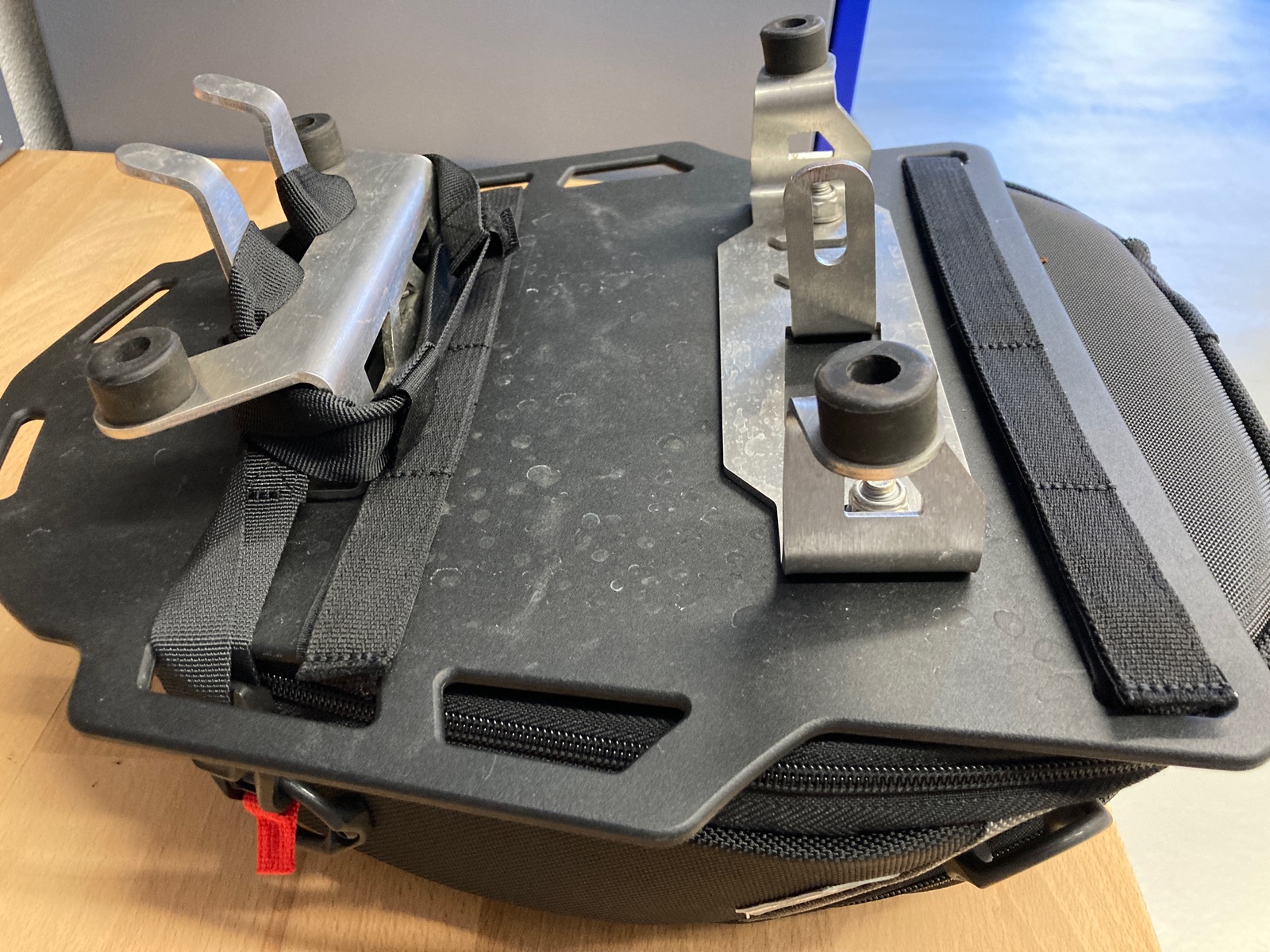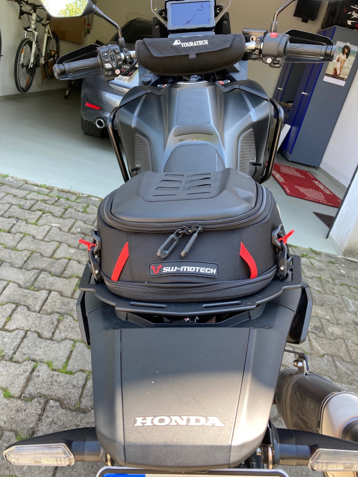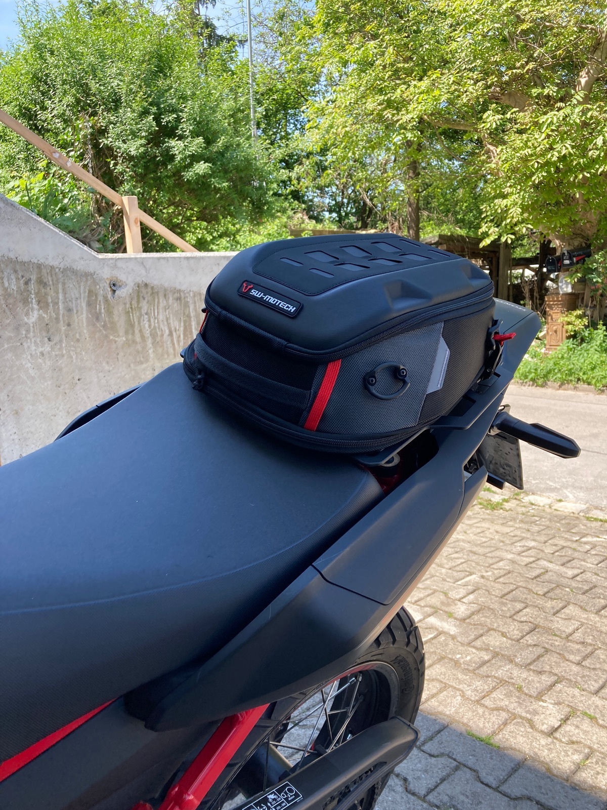 Hy, ist eine SW-Motech Hecktasche Pro Roadpack 8-14 Liter. Montiert ist es an eine „Altrider Skip Plate“ durch die vorgegebenen der Platte musste ich die Hecktasche ein wenig nach vorne ziehen. Es gibt auf der Unterseite Klettverbände mit denen ich die Tasche fixiert habe, da sie weiter vorne ist, habe ich hinten zusätzlich noch die Hacken angebracht, hält bombenfest. Mir taugst, … und da die Tasche unten verbunden ist kann man Sie auch ohne weiteres nicht entfernen. Anbei ein paar Bilder
