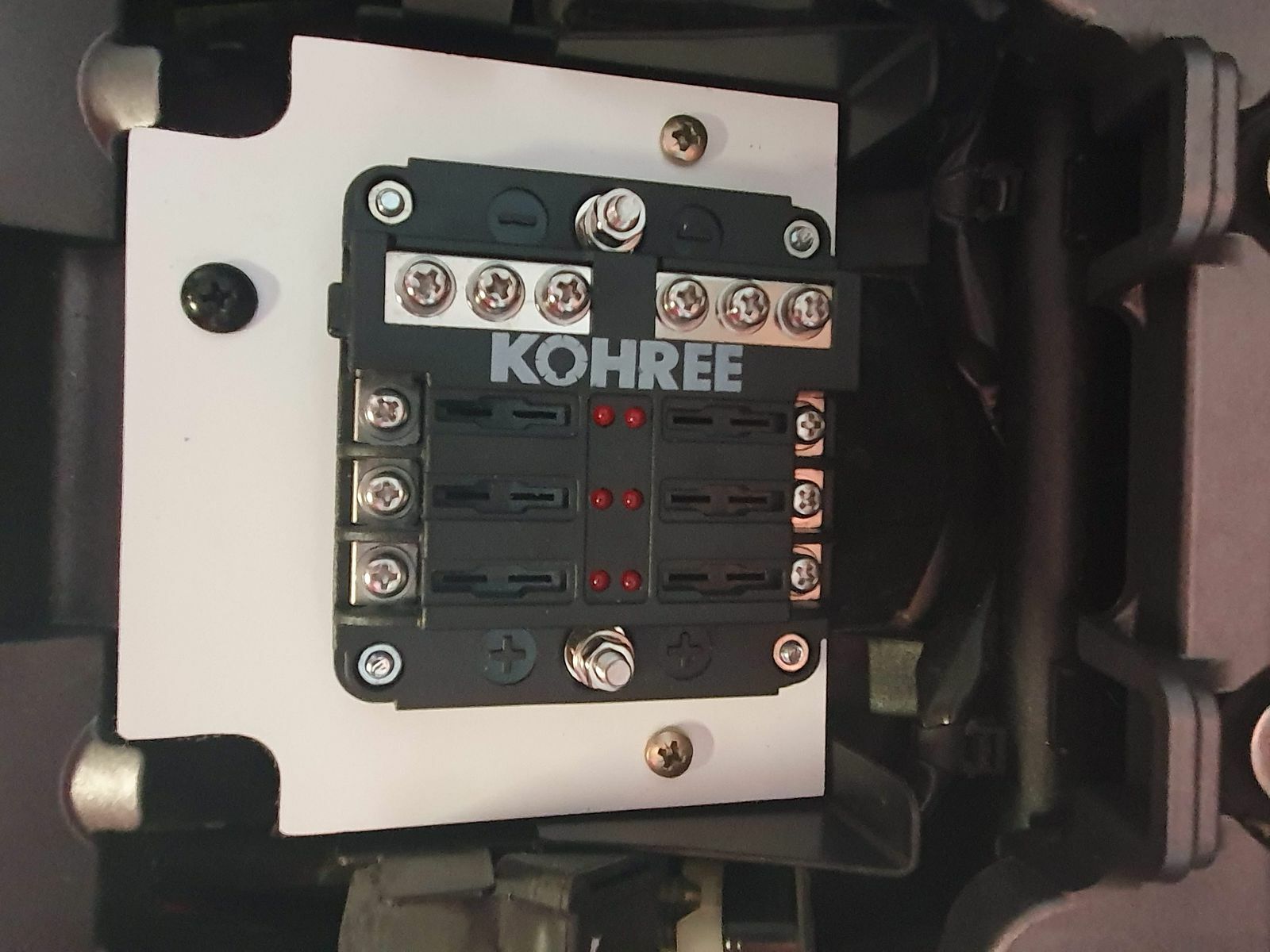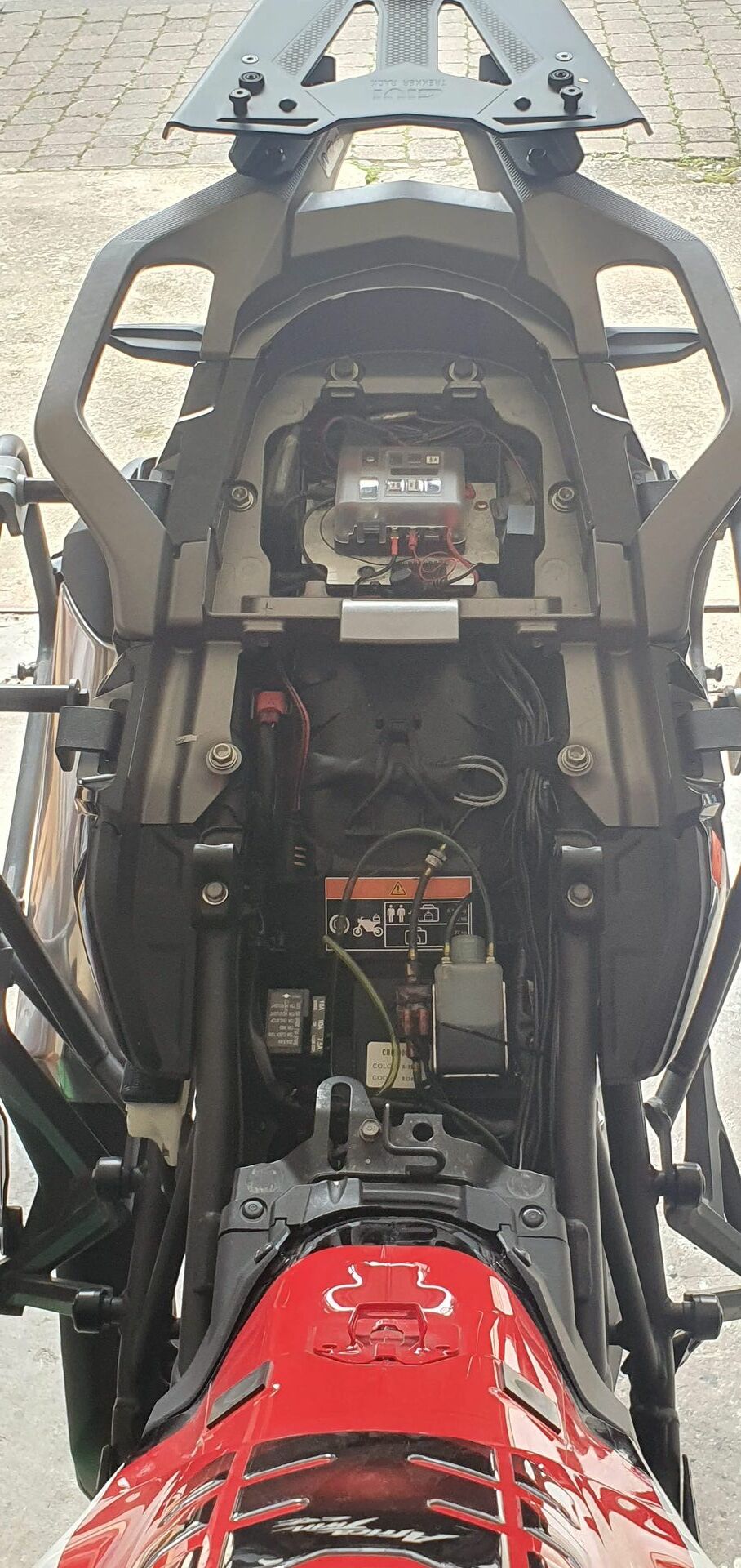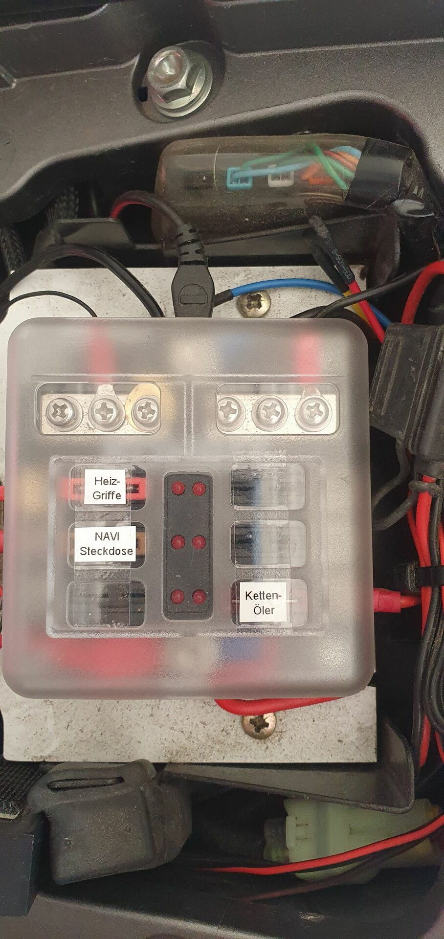 Die Stromversorgung war vorher nur irgendwie gefrickelt. Hier habe ich mir unter den Soziussitz einen kleinen Zusatzsicherungskasten gesetzt, in dem nun diverse Stromabnehmer einzeln angeklemmt wurden.