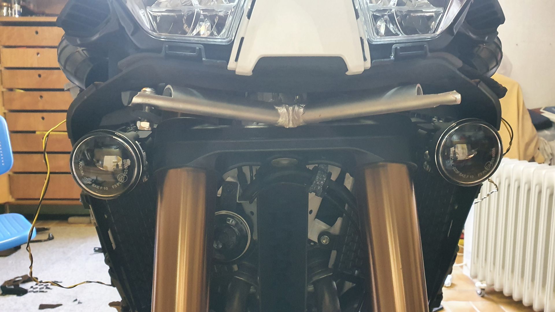 mmh, die Zwischenboxen sind unter der Sitzbank verbaut, daher sind die Kabel der Scheinwerfer auch dahin gezogen worden.