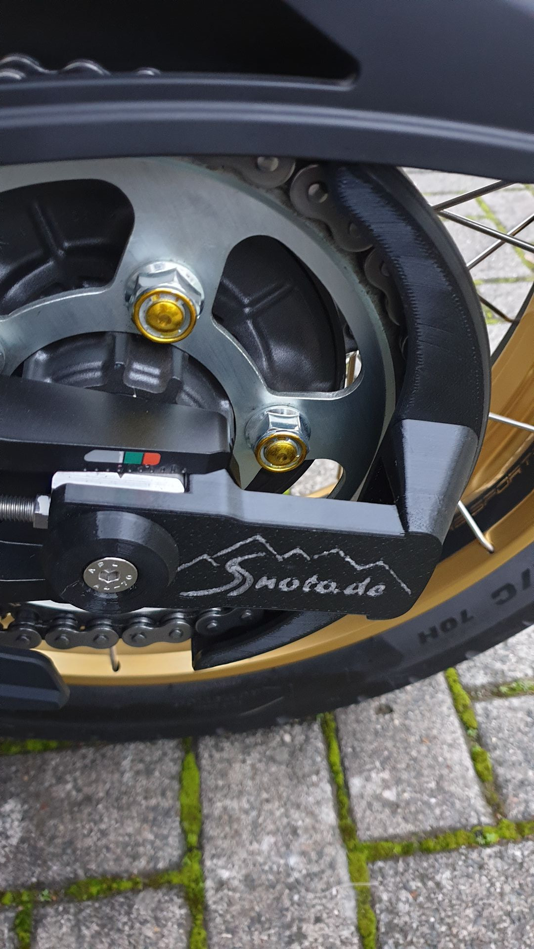 Ich hab mir einen SNOTO Kettenschutz gegönnt. Leider habe ich die Farbe Gold passend zu den Felgen bestellt.