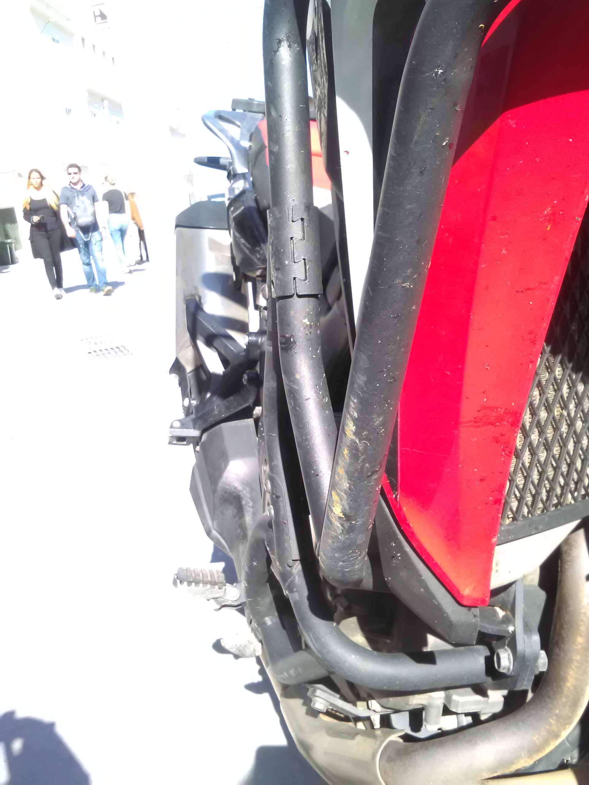 Die SD04, die ich in PT hatte hat GIVI-Bügel dran glaube ich. Rechts hatte Sie wohl schon einen ziemlichen Klatscher. Der Bücgel war bis zum Tank reingebogen und nur nuch 5mm weit weg und der schwarze Tankschutz hatte schon einen Riss, durch den Einschlag. Die Halterung vorne am Geweih war völlig krumm. Merkwürdigerweise aber nach Rechts, obwohl da der Aufprall war. Aber das Geweih war nicht verbogen! ![]()