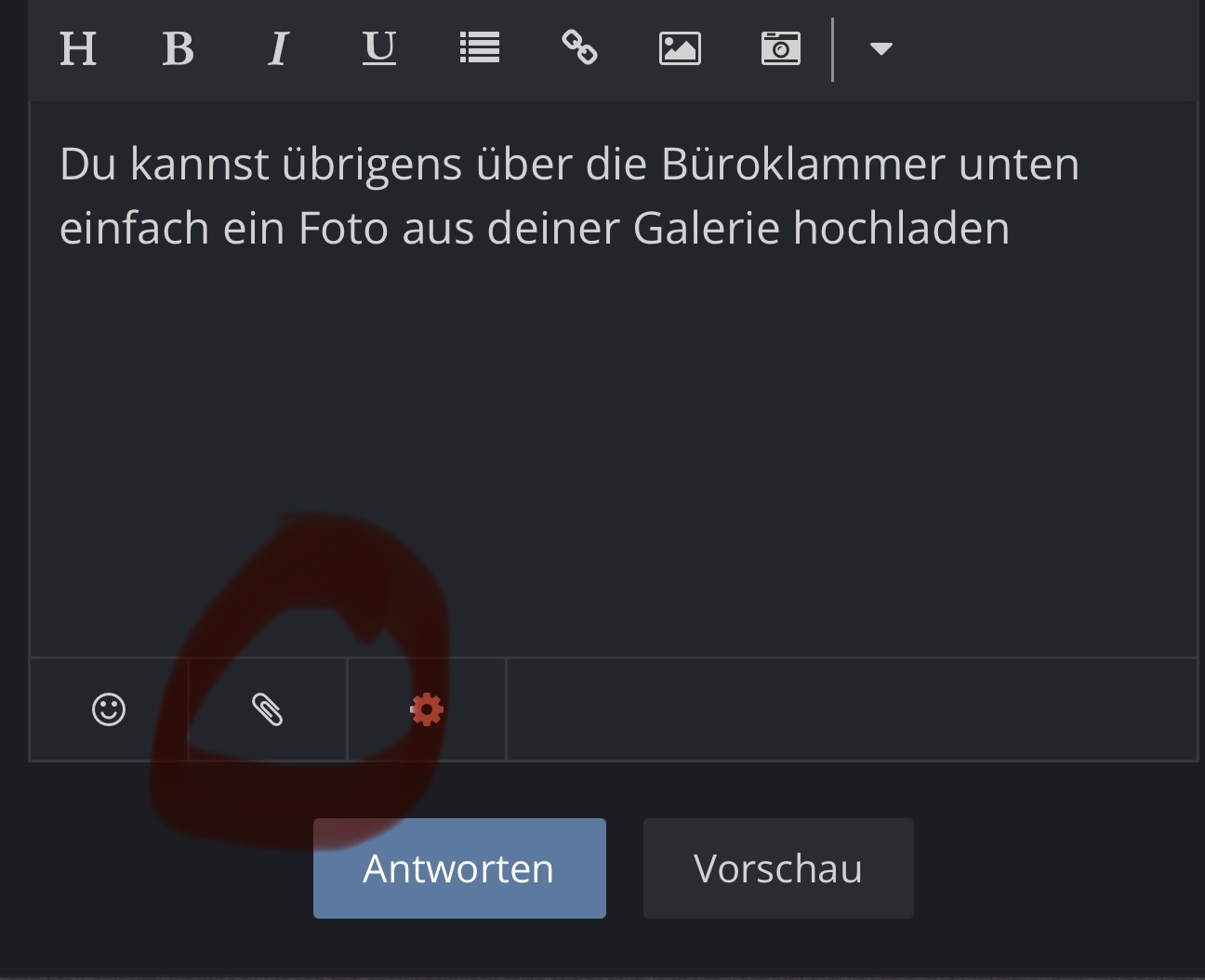 Du kannst übrigens über die Büroklammer unten einfach ein Foto aus deiner Galerie hochladen