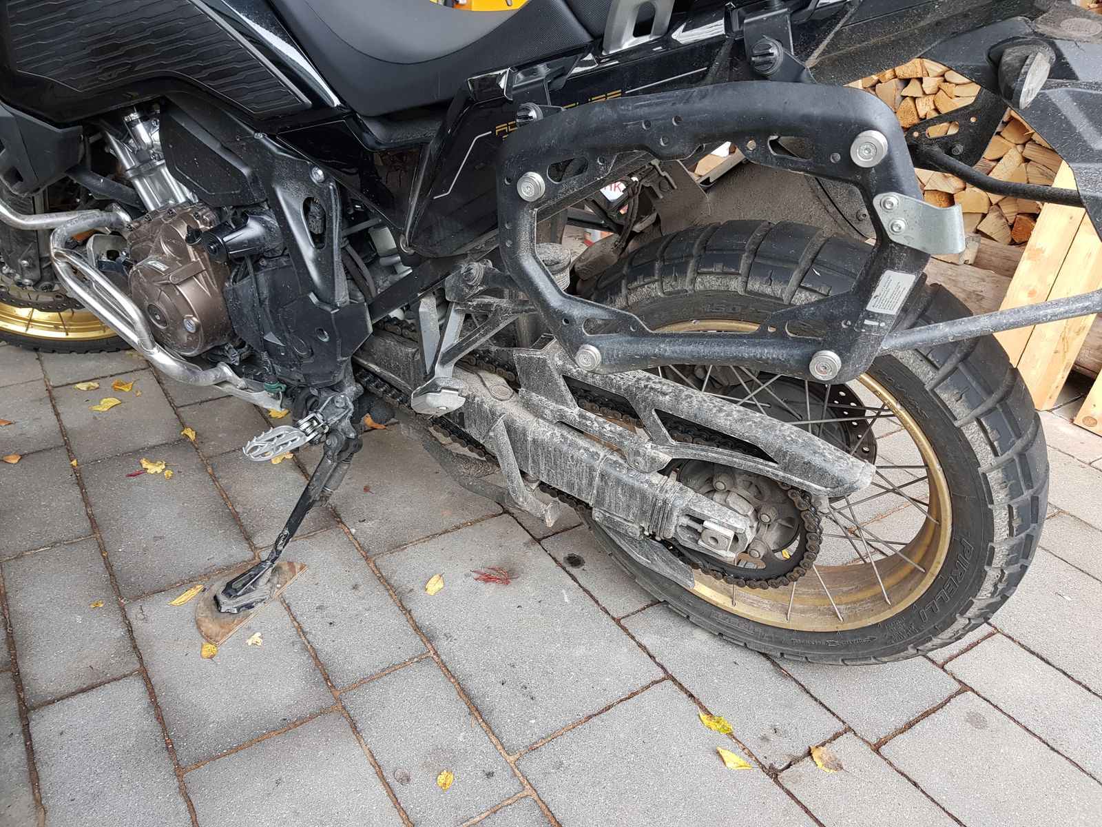 Der Schnüddel könnt zwar bissi besser sitzen aber ich pinsel die Kette zwischendurch auch immer wieder mal ein. Dank Hauptständer eine Sache von nicht mal 2 Minuten.