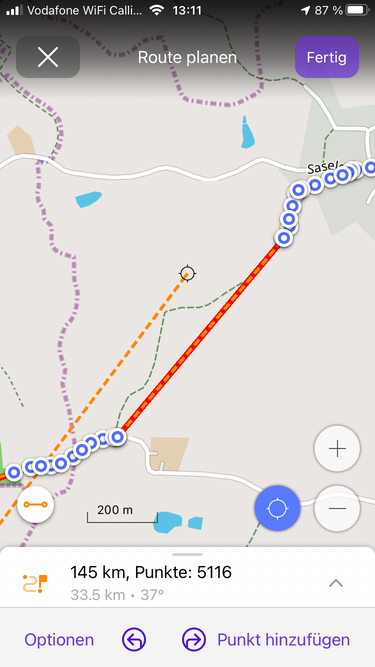 Allerdings, aus bekannten Gründen, keine offroad-Touren. Leider wird dann die ganze Tour nicht importiert. Ich hatte bei den Entwicklern mal angeregt, dass sie ja die offroad-Passagen zwischen dem letzten legalen Punkt und bis zum ersten darauffolgenden legalen Punkt mit einer Luftlinie überbrücken könnten, aber da iat nichts passiert – leider!