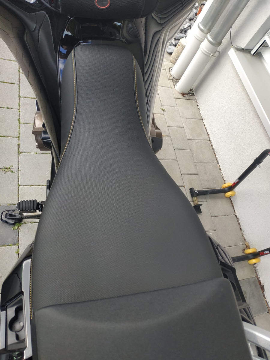 Ich stelle ein paar Bilder rein, ich hab mir nur die Fahrersitzbank machen lassen, ich hab die Sozius-Bank der ATAS belassen, da ich meist alleine fahre. Die Jungbluthsitzbank hat eine goldene Naht, was sich sehr schön integriert. Ich werde die Sitzbank weiter testen und erlaube mir noch meine Erfahrungen auch bei längeren Strecken zu schildern.