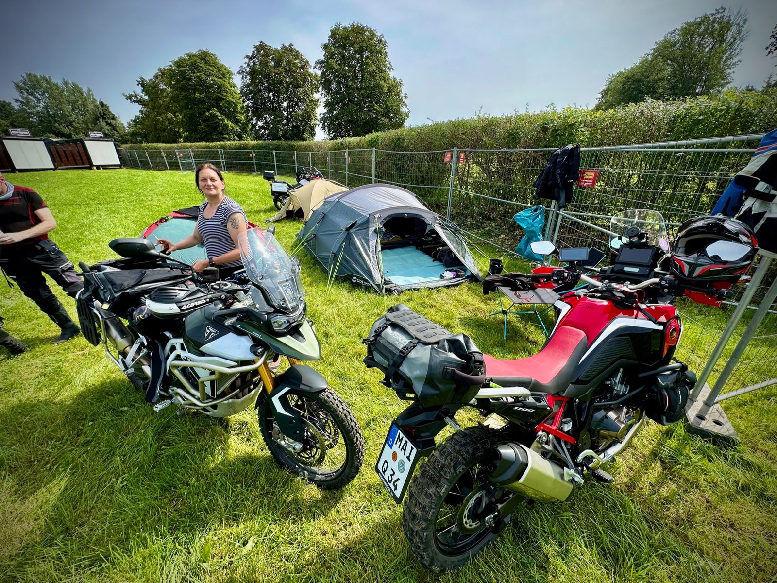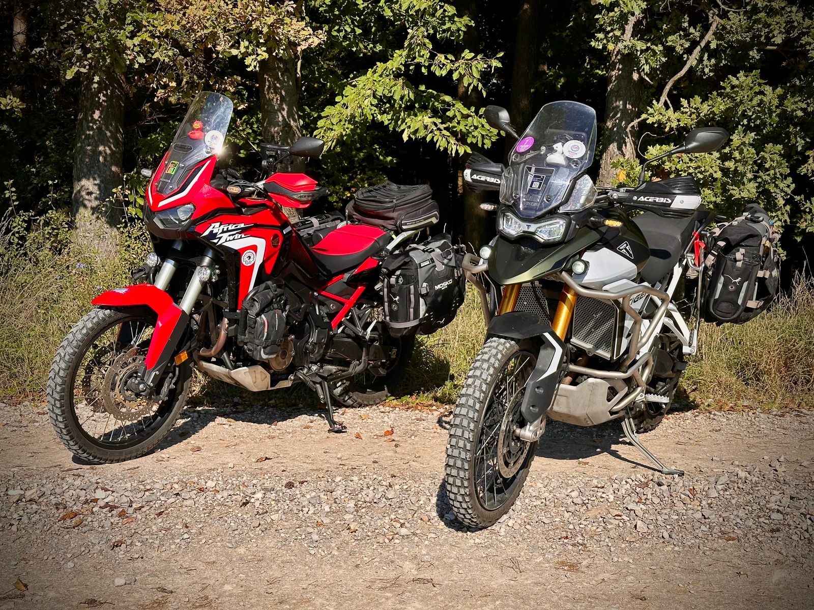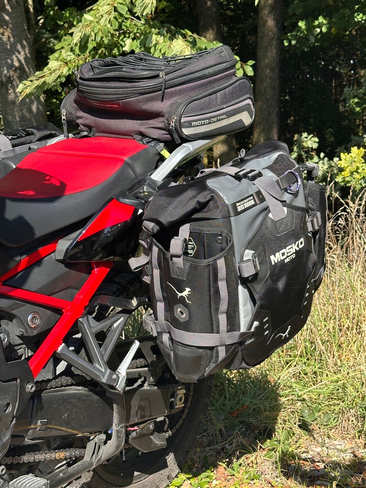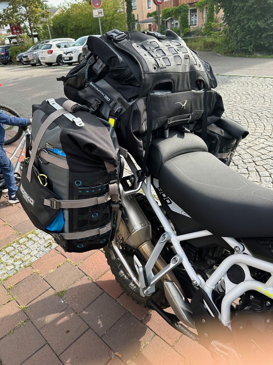 Was mich an den MoskoMoto System gestört hat, war die vielen Gurte und das Einrollen der Gepäcköffnung. Ich wollte auch keinen Gepäckträger montieren. Koffer sind da halt wesentlich praktischer. Aber meine Frau hatte auch einen Umfaller und es war halt gar nichts kaputt. Die Gefahr den Fuß im Off Road einzuklemmen ist auch niedriger. Das System ist Modular aufgebaut und kann erweitert werden. Es git zig Möglichkeiten es individuell anzupassen. Meine Das letzte Bild war letztes Jahr als wir auf das Maxlride gefahren sind. Wir hatten wirklich alles dabei. Zelt, Zwei Stühle, Tisch und die komplette Campingausstattung.