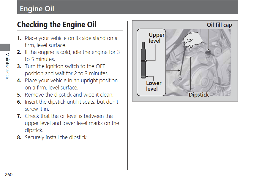 Außerdem erhalte ich bei gleichem Ablauf (genau wie Honda es vorschreibt) jedes Mal unterschiedliche Ergebnisse abhängig von Außentemperatur und Wartzeit. Nach 2 Minuten ist der Stab so gut wie trocken, nach 3 Minuten knapp unter Viertel, nach 5 Minuten 3/4 voll.