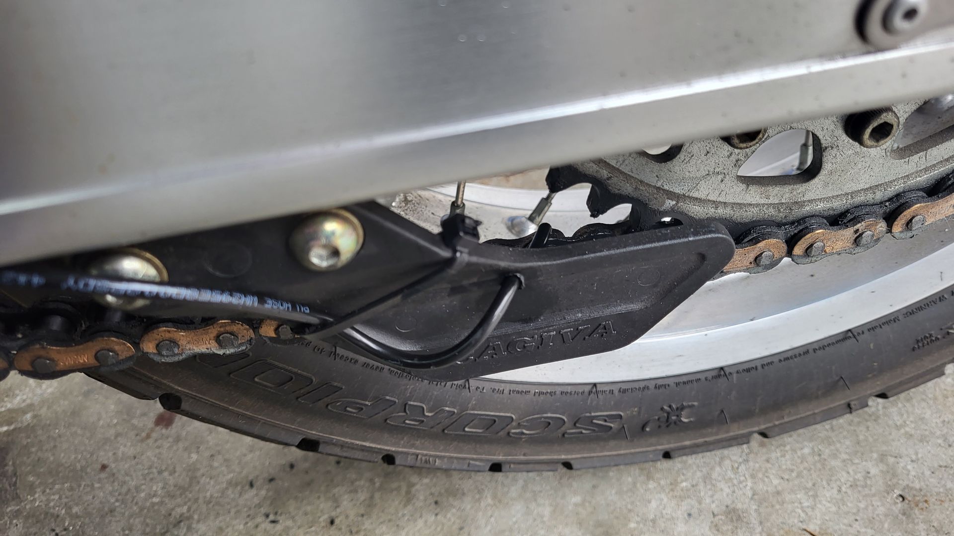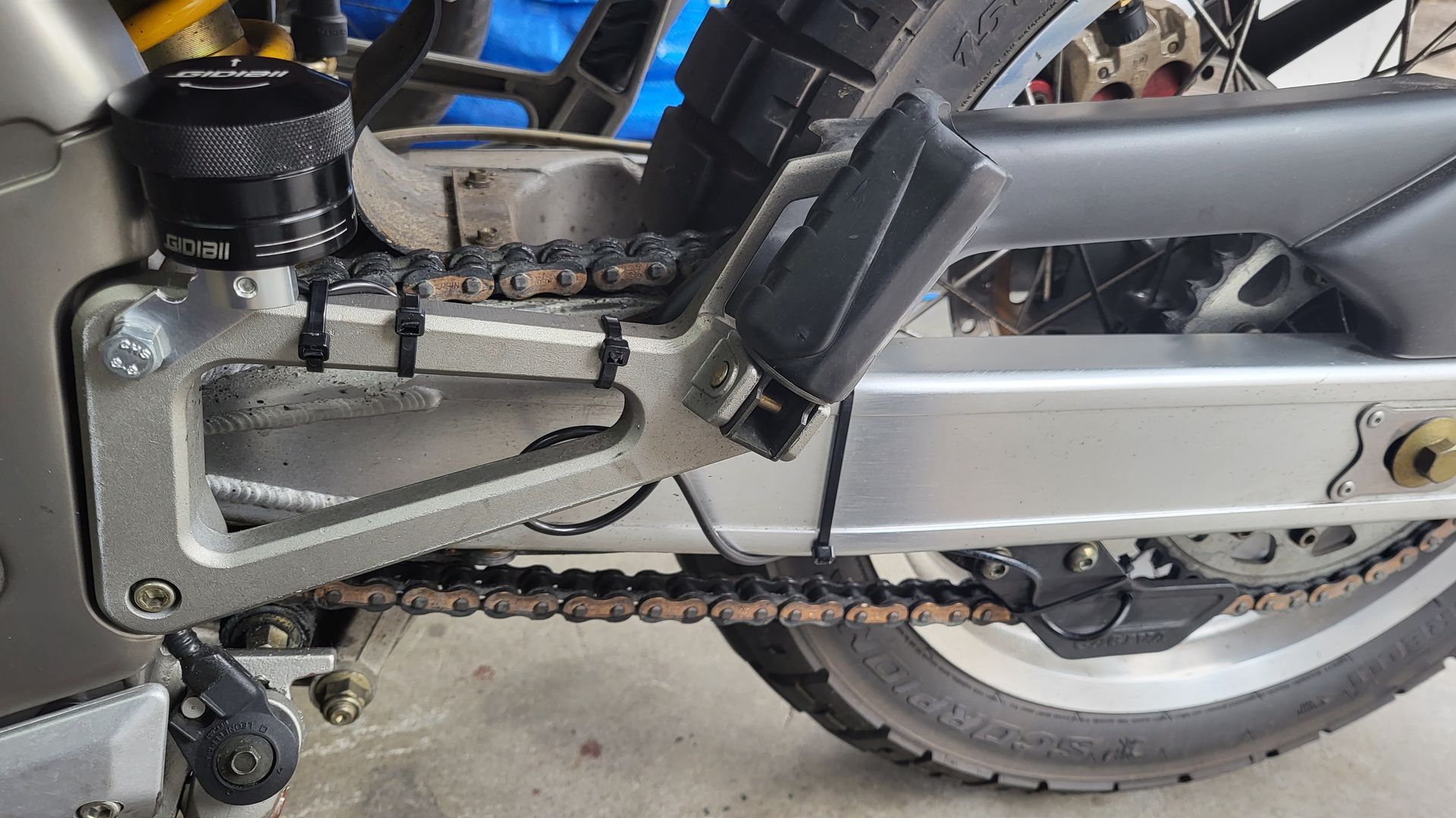 Hier ein Bild, wie ich meinen Oeler befestigt habe. Es gibt dann ein Trassee für die Leitung auf die linke Seite und ist seitlich an der Schwinge durchgeführt. Die Befestigungsschraube am Motorblock ist um 3 mm länger als die OEM Schraube und mit dem vorgeschriebenen Drehmoment angezogen, so dass da am Motorblock kein Problem entstehen sollte.