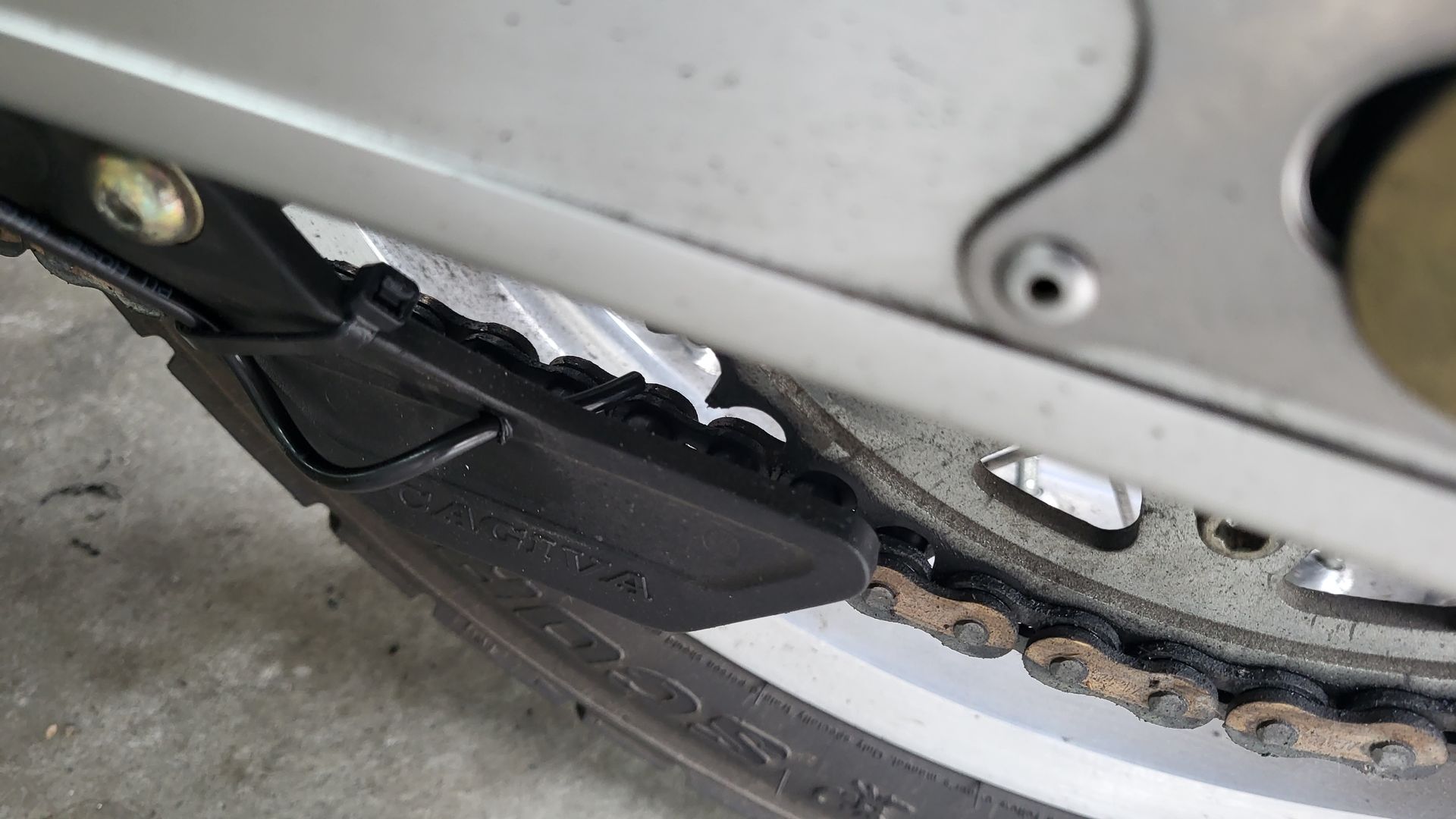 Hier als Montagebeispiel die Bilder. Das Schlauchende habe ich auch bei der AT etwa so installiert, ein schräges 4mm Loch in die Kunststoffabdeckung gebohrt. Den Schlauch dort durchgeführt. Er endet kurz vor dem Zahnkranz, in der Mitte der Kettenglieder. So wird das Oel optimal auf die ganze Breite der Kette verteilt, also die Glieder beidseitig eingeölt.