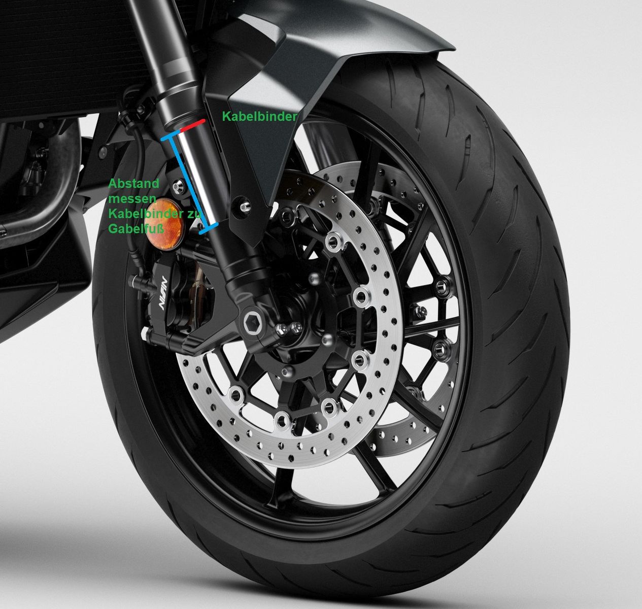 Zieh die Gabel ein bisschen aus den Federn und lass unterhalb des Simmerrings den Kabelbinder anbringen. Der soll sich gerade noch so verschieben lassen. Lass das Motorrad wieder mit dem Eigengewicht nach unten sinken. Miss den Abstand zwischen Kabelbinder und dem Gabelfuß. (Motorrad einfach senkrecht mit Eigengewicht auf den Rädern stehen lassen, nicht auf Ständer usw.)
