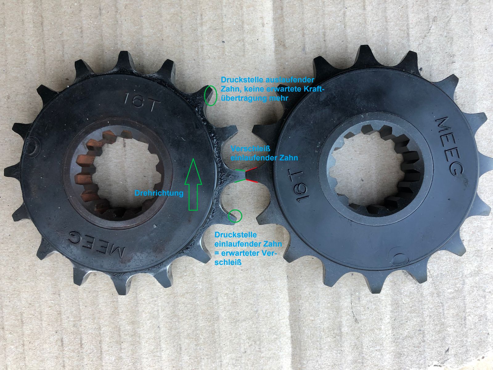 Vielleicht (und dann auch abschließend für das Thema Verschleiß am Ritzel) noch zwei Bilder die zum Nachdenken anregen sollen: