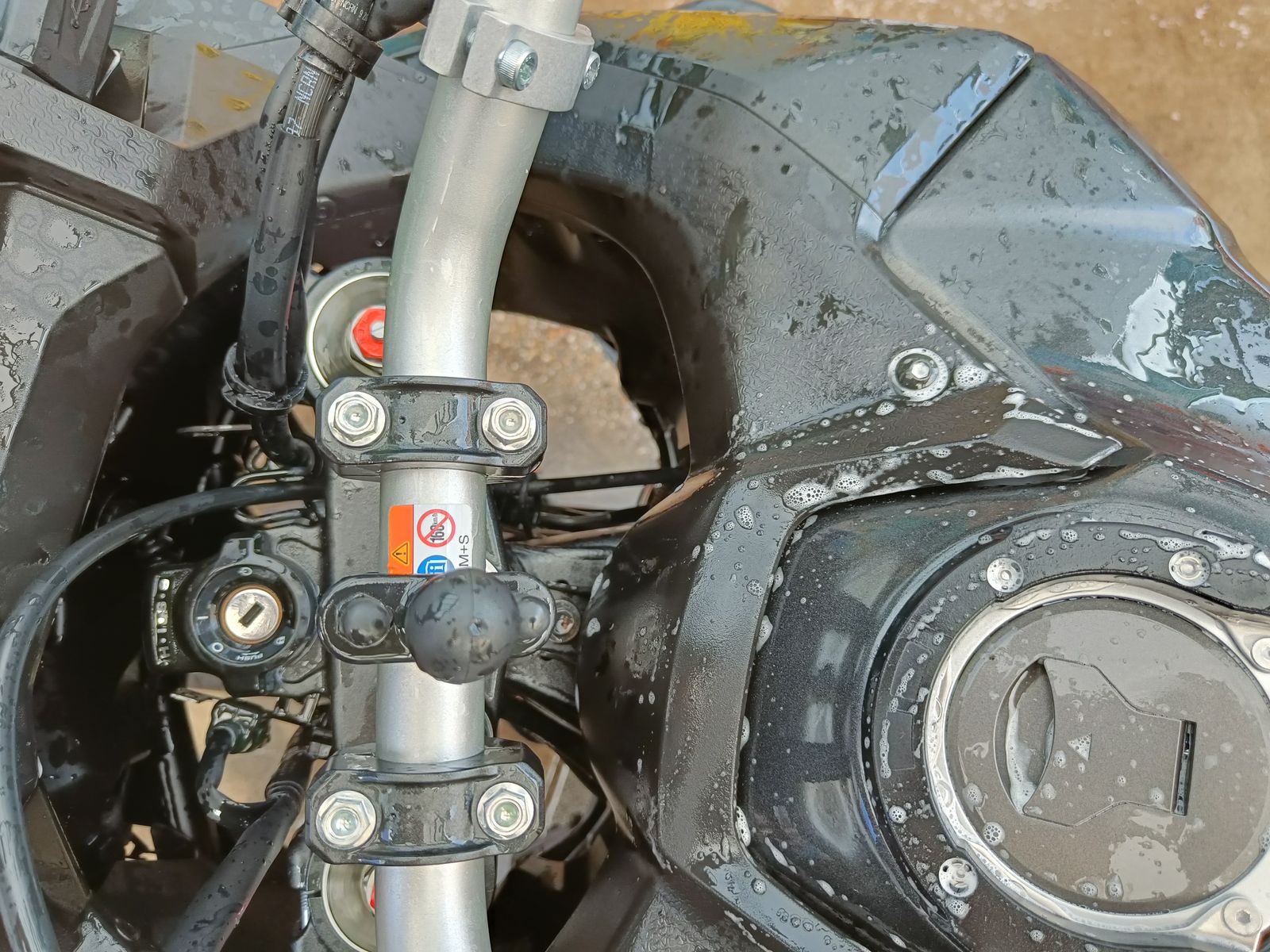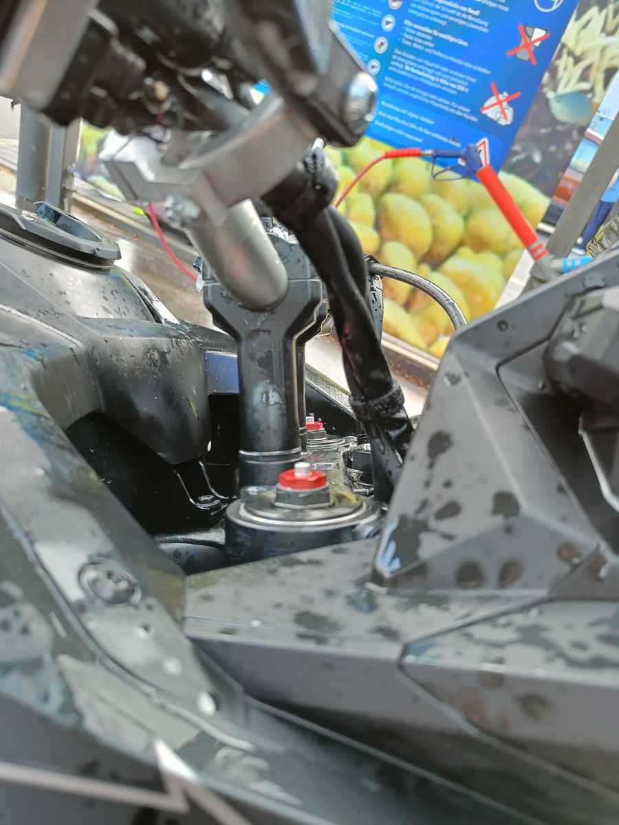 Als ich aufs Motorrad stieg, viel mir auf, dass der Lenker im Vergleich zum Vorderrad leicht schief ist. Wenn das Vorderrad gerade steht, ist der Lenker leicht nach rechts eingeschlagen.