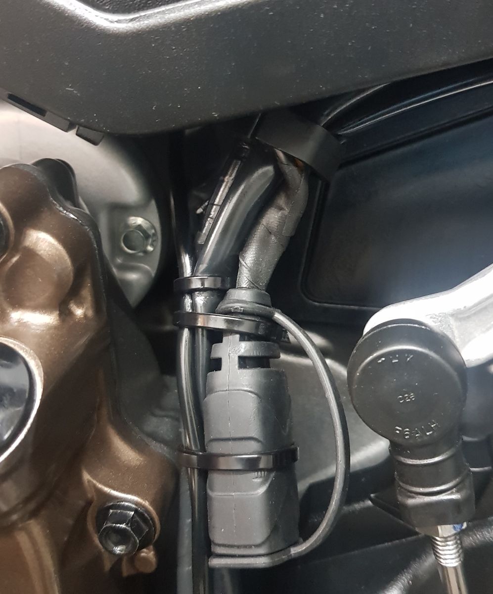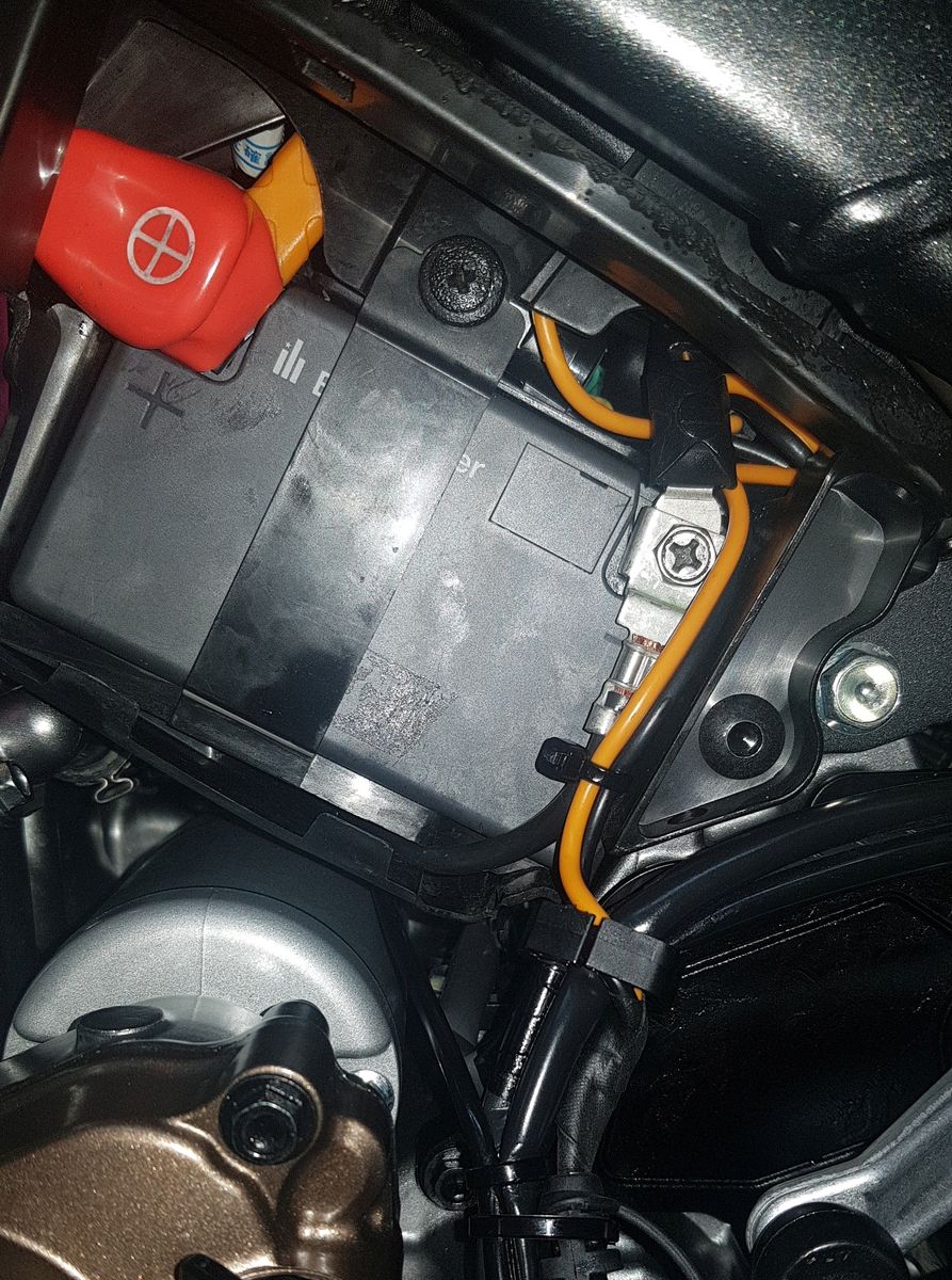 Unterdessen habe ich meinen Zusatzeinbau noch etwas verfeinert und das orange Kabel mit einem schwarzen, selbstvulkanisierenden Gummistreifen umwickelt. Sieht besser aus.