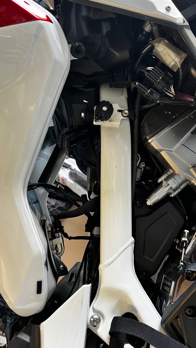 Den Tank habe ich am Lenker mit Kabelbinder befestigt , und den Öler selbst habe ich auf der linken Seite im Seitenkaten verlegt, dazu habe ich die schwarze Plastikblende unterm Sitz demontiert und später etwas ausgeschnitten damit man ran kommt zum verstellen und nachfüllen .