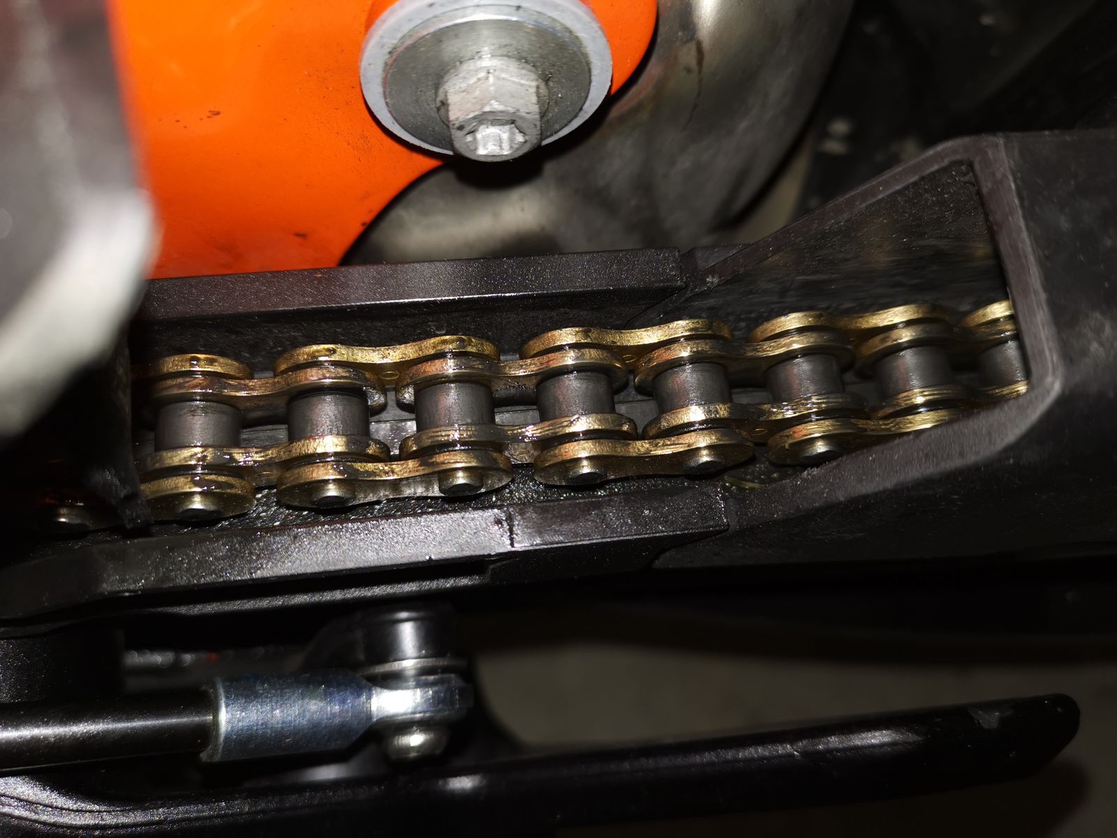 Bild 2.) Zeigt das die kette schön geschmiert ist. Auch zwischen den gliedern und die roller glanzen leicht, so dort kommt auch öl hin.
