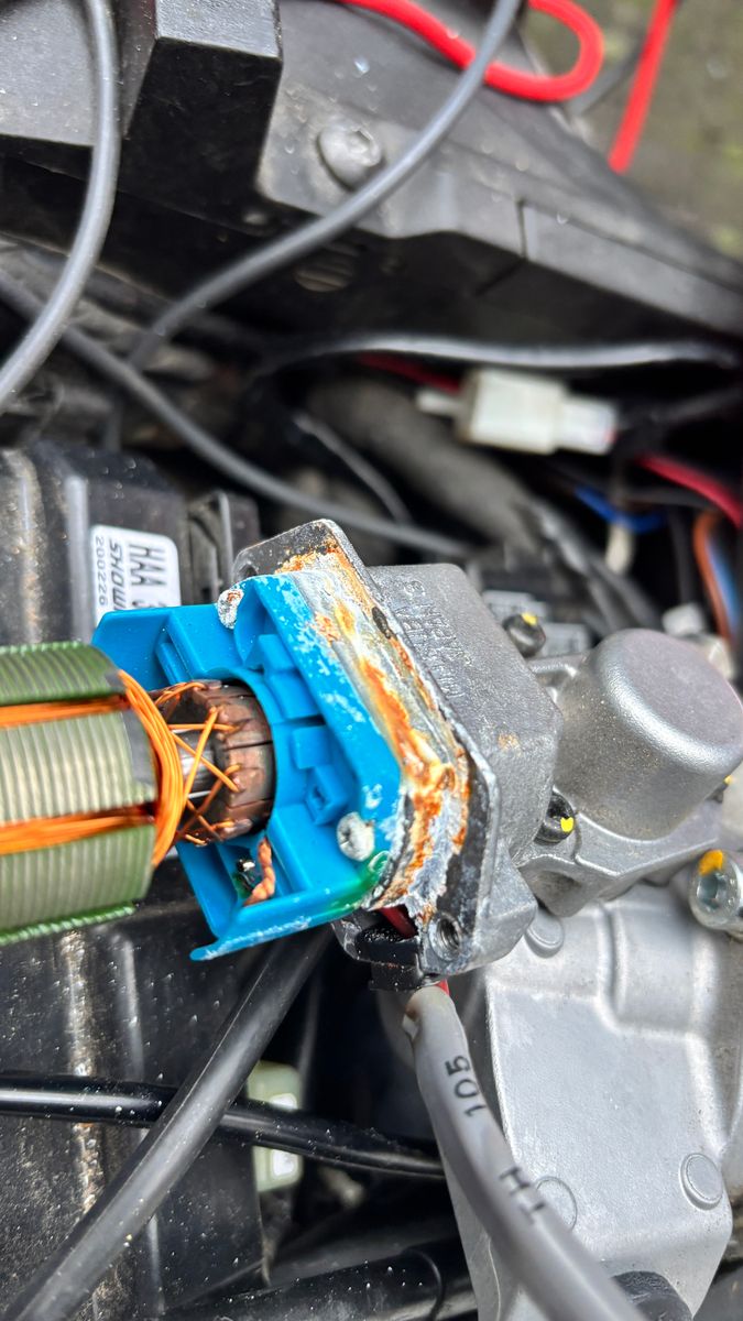 Hab bei meiner Twin den gleichen Fehler. Motor hat gleiche Korrossionsspuren. Das Fett im Schneckenantrieb war mit Wasser gemischt. Scheint ein Serienfehler zu sein. Der Gummischutz hat einen Schlitz, damit man den entfernen kann und das Gehäuse vom Motor hat einen Einschnitt als Wasserablauf der aber nicht an der tiefsten Stelle sitzt. Ich war nie mit einem Hochdruckreiniger am Mopped. Muss mir jetzt mal in Ruhe ansehen wie das Wasser dahin kommt.
