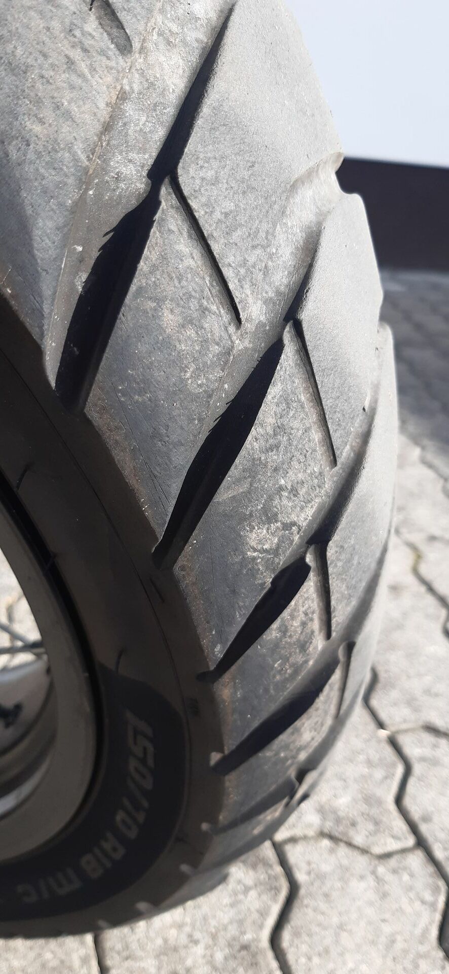 Hinten ist kurz vor Verschleissgrenze. Die Blöcke an der Seite haben starke Auswaschungen , welche sich (glaub ich ) schon bei schnellen Kurvenräubern zu zweit bemerkbar machen.
