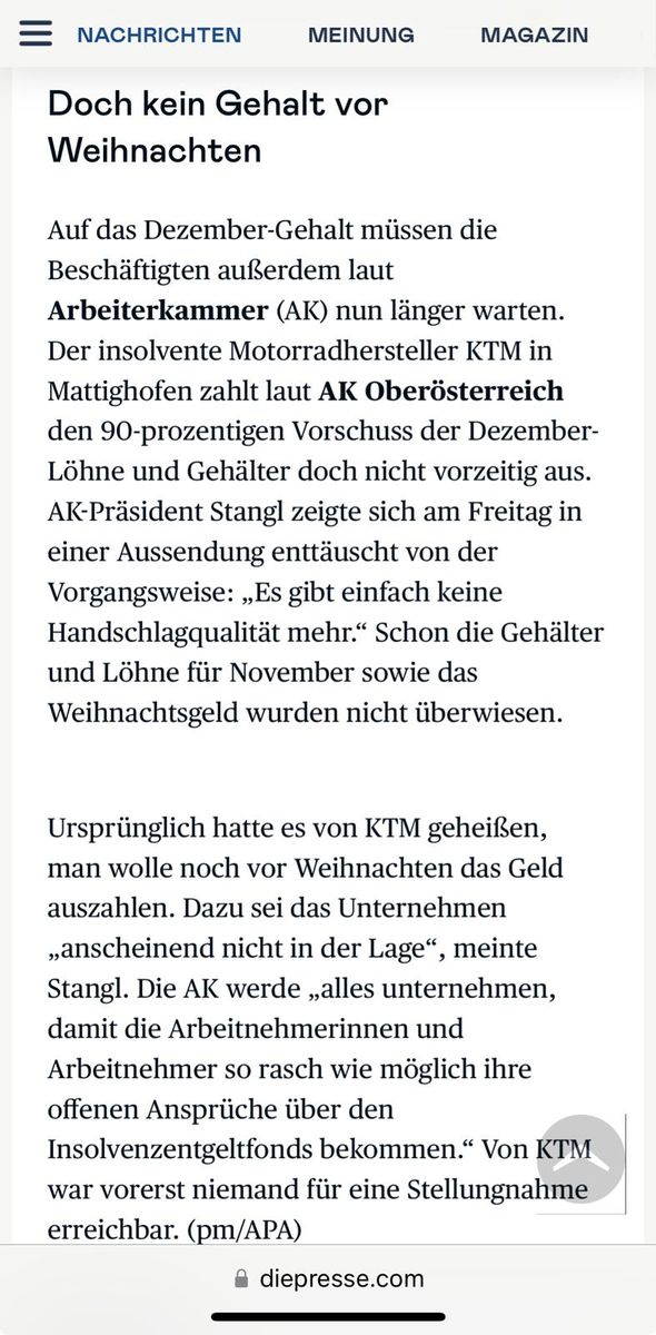Leider wurde/wird heute in den Nachrichten (österr. Rundfunk u.a.) kundgetan, dass KTM die Dezembergehälter (und davon nur 90%) doch nicht vor Weihnachten wird auszahlen (können).