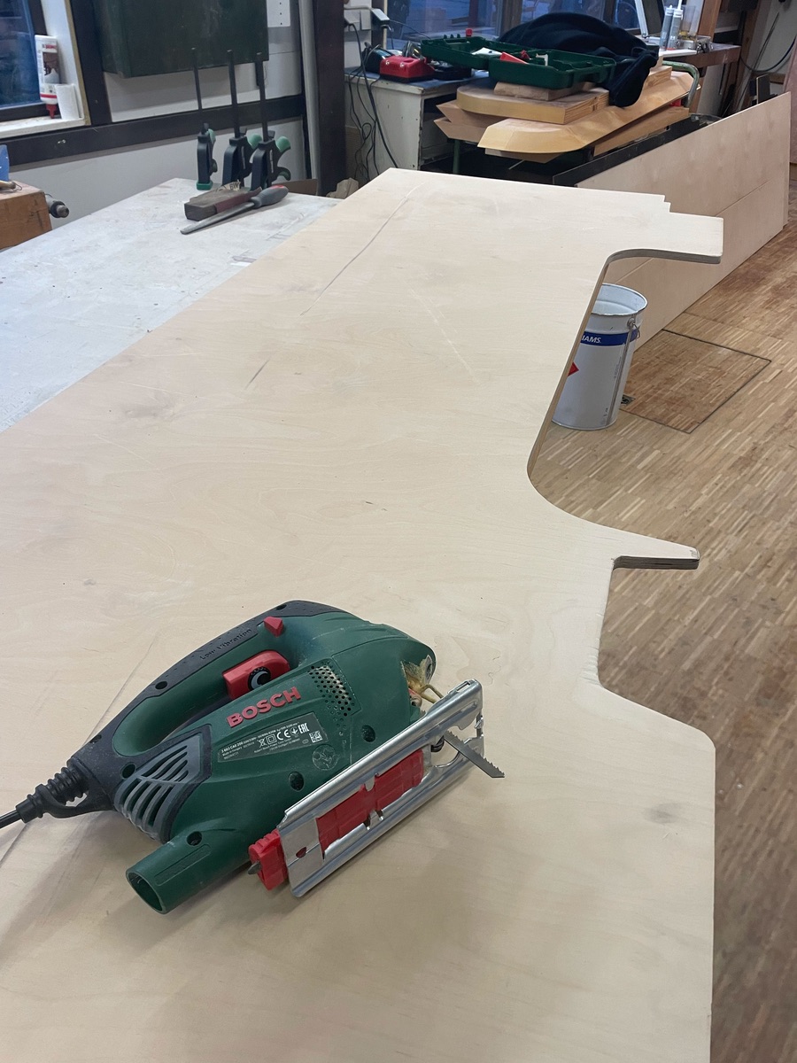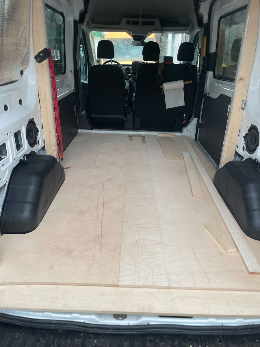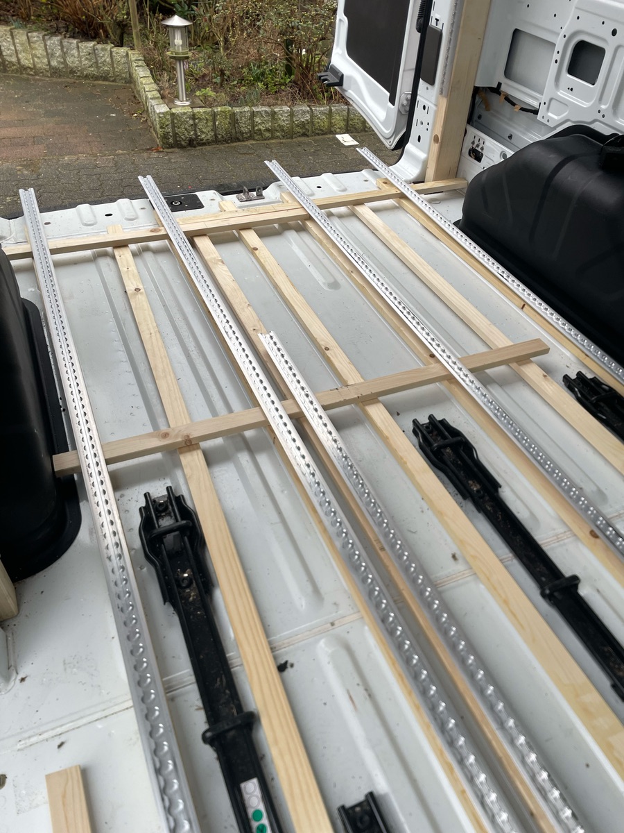 Aber die Unterkonstruktion ist an den Boden angepasst und die neuen Bodenplatten zugesägt. Zum Glück hat mich der örtliche Tischler in seine Werkstatt gelassen, da war es wenigstens trocken.