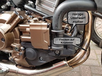 2.Die Flecken auf dem KrümmerEventuell ist ja die WP oder eine andere (Kühlflüssigkeits) Leckage schuld. Hat noch jemand diese rostige Überwurfmutter ?