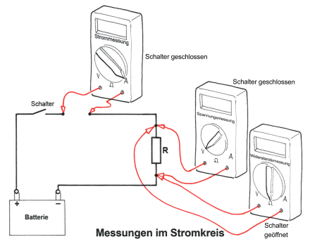 Widerstand: EInheit Ω Ohm; mathematisch R; messen parallel zum Verbraucher, es darf aber nichts eingeschalten oder mindestens eine Seite des Verbrauchers muss in der Luft hängen.