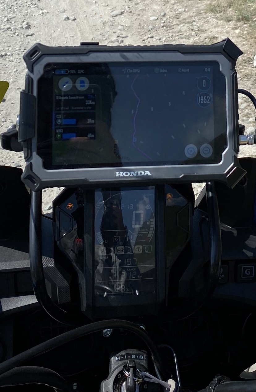 Der Strom kommt vom Zubehörstecker vorne. Den Spannungswandler, der mit dem Carpe Iter geliefert wird, habe ich allerdings durch eine 5A-Version ersetzt. Das kleine Teil in einem 3D-gedruckten Gehäuse kam mir nicht besonders vertrauenserweckend vor. Um den Ladestrom zu schalten, habe ich einen zusätzlichen Schalter an die Touratechhalterung geschraubt. Allerdings ist der aber immer angeschaltet, da die Automatische An- und Abschaltung des Tablets mit dem Ladestrom und die Ladeautomatik, die den Akku zwischen 60% und 80% hält jegliches Eingreifen erübrigt. Lediglich das Eingeben des SIM-Pins für die Mobilfunkverbindiung nervt dabei etwas.