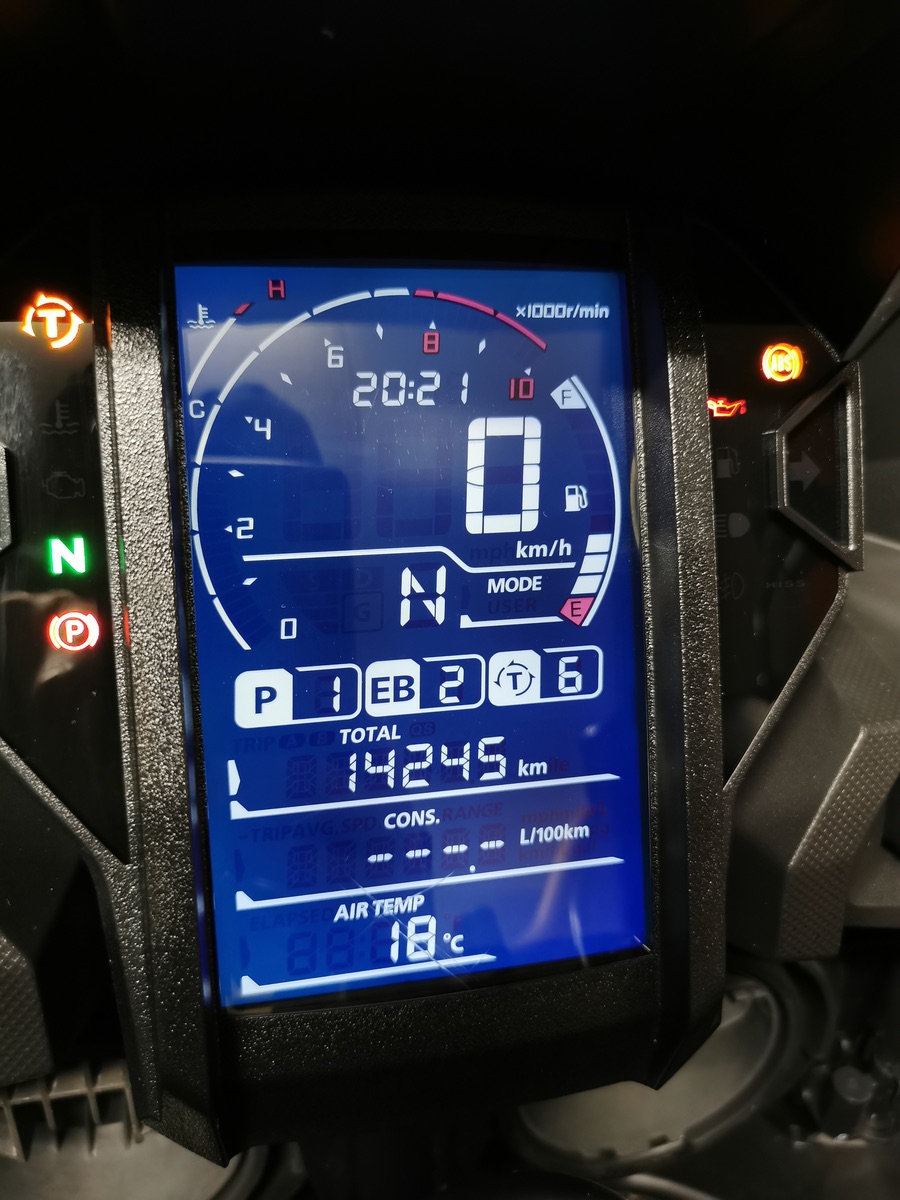 Zubehör: 12V Steckdose / Kit Visier (vorne li + re) / Griffheizung Honda / Zentralständer / Kit Deflector (unten beim Kühlergrill WIndabweiser / Topcase