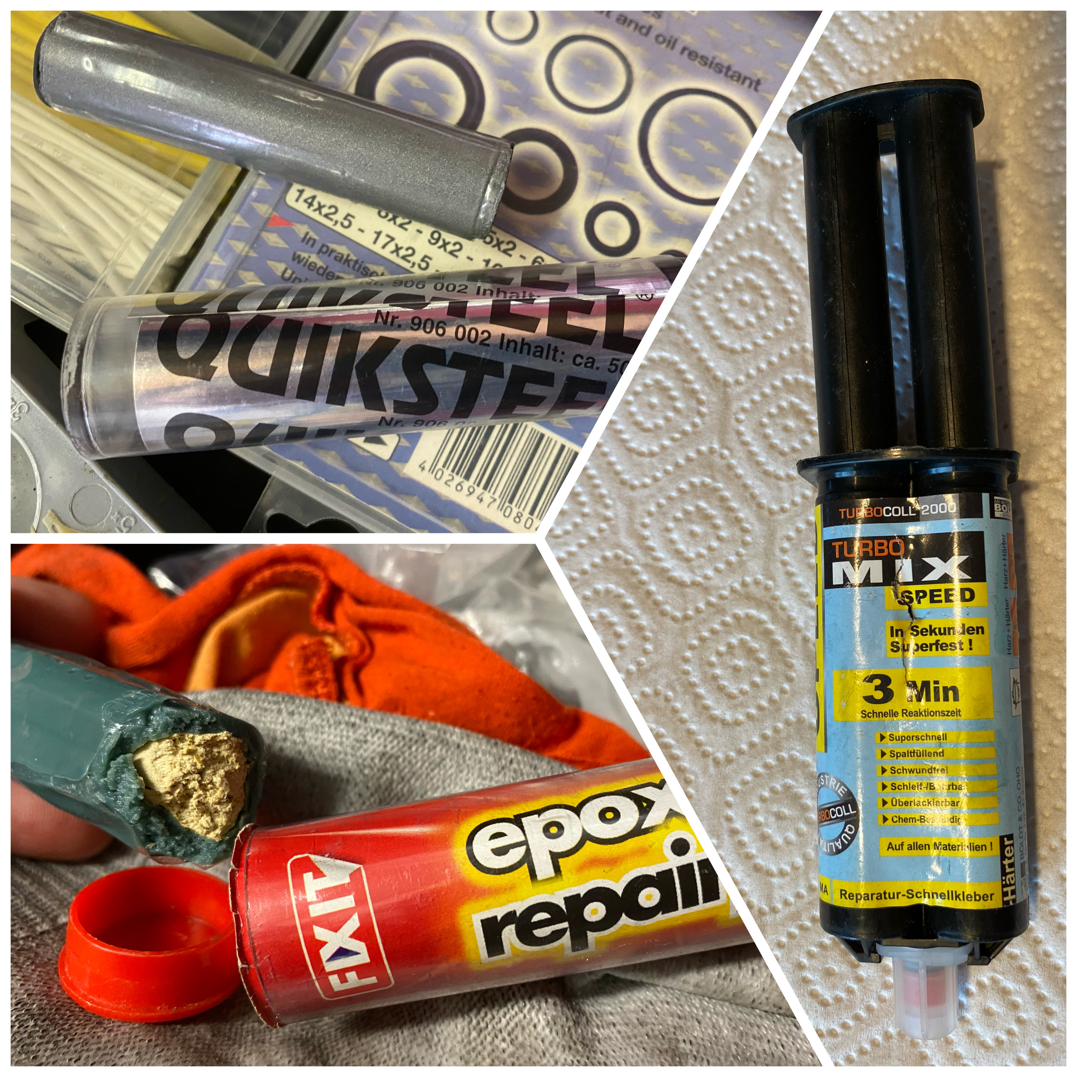 Ich selber habe ein paar Sachen hier liegen. Das berühmteste ist JB Weld. Das absolut Beste ist BELZONA 1111. Damit klebt die Bundeswehr im Einsatz.....