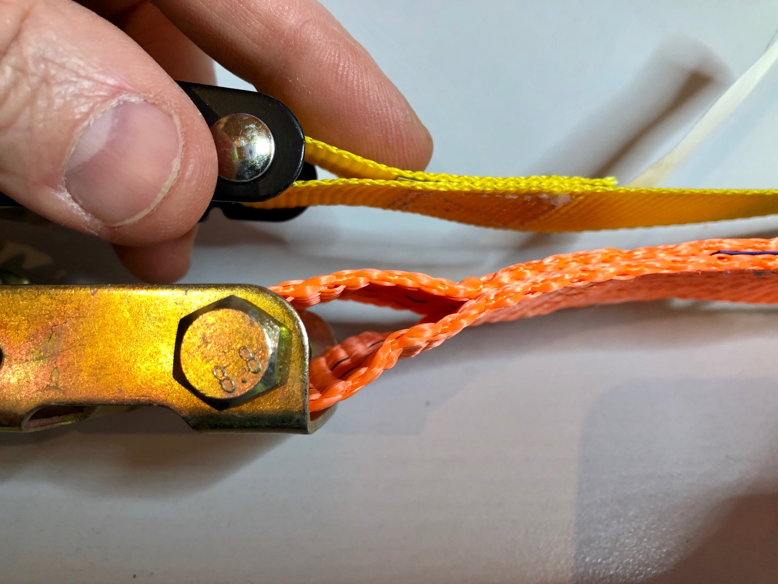 Genau wie bei Andreas haben meine auch keine Haken. Einfach nix dran. Lässt sich auch am besten durch die Gabelbrücke ziehen. Die Dinger haben die 2000daN wenn Du diese im Kreis spannst. Und das tut man ja Üblicherweise beim Hänger mit Ösen.