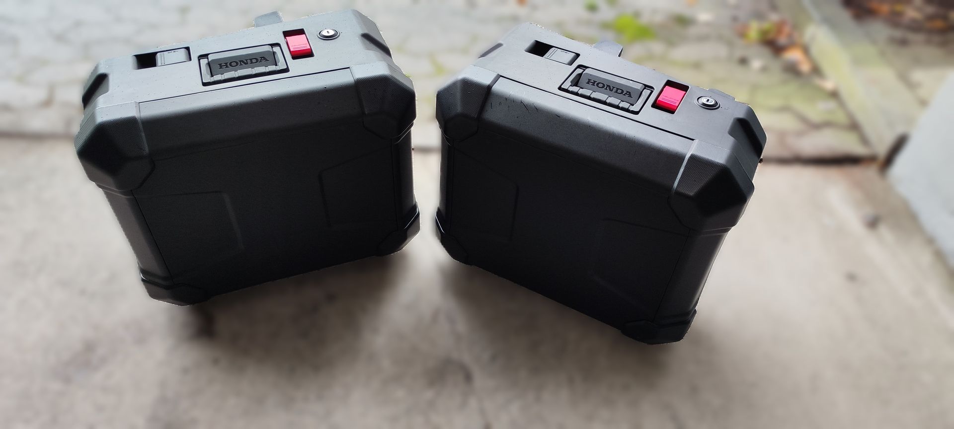 Die Konstruktion des Koffers verhindert, dass dieser herunterfällt, wenn Sie Ihre Honda auf den Seitenständer stellen. Dank ihrer zweischaligen Außenhülle werden die Koffer von einem Deckelrahmen geschützt, welche bei Bedarf ausgetauscht werden können.