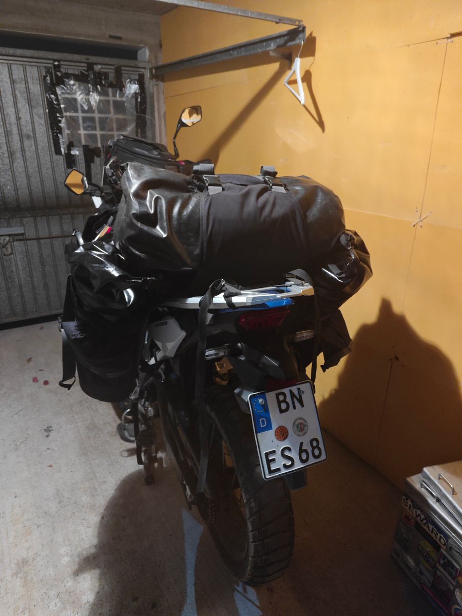 Die Befestigung baut sehr schmal am Motorrad, da die integrierten vorhandenen Halterungen benutzt werden. Da ich auf eine Offroadtour gehe, rüste ich nun auf Softgepäck um.