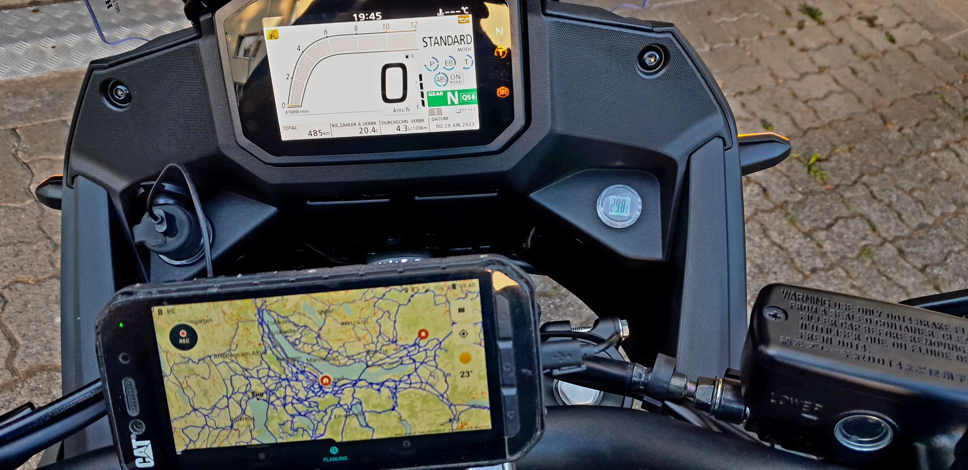 Deshalb habe ich mein CAT Handy mit dem Calimoto App auf der Lenkstange so platziert, dass sich aus der Fahrersicht einen fliessenden Übergang zum Bildschirm ergibt.