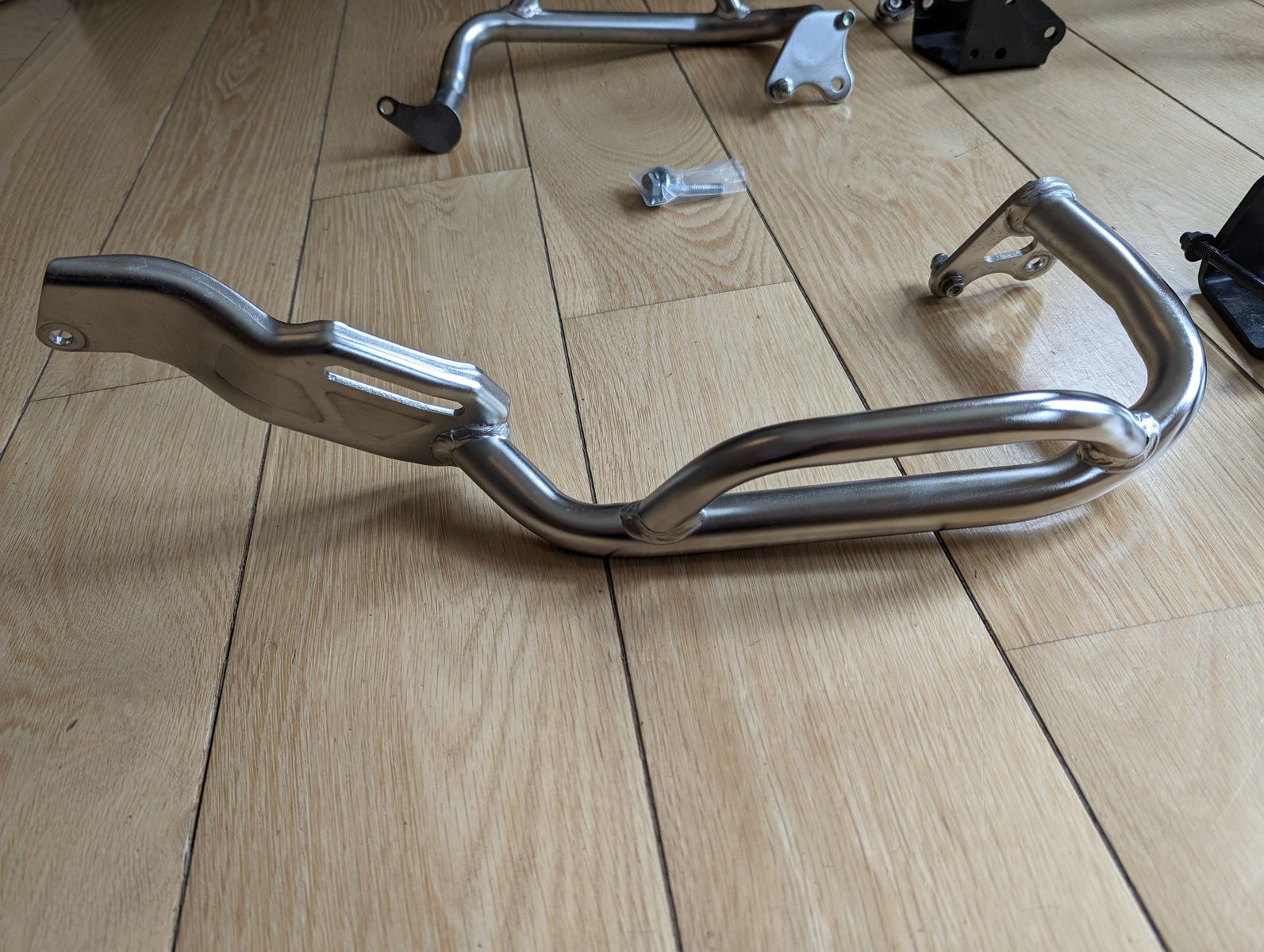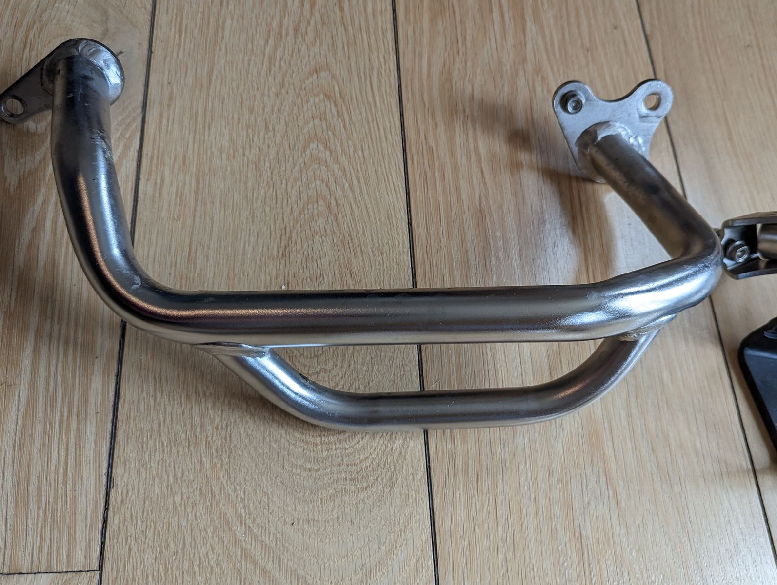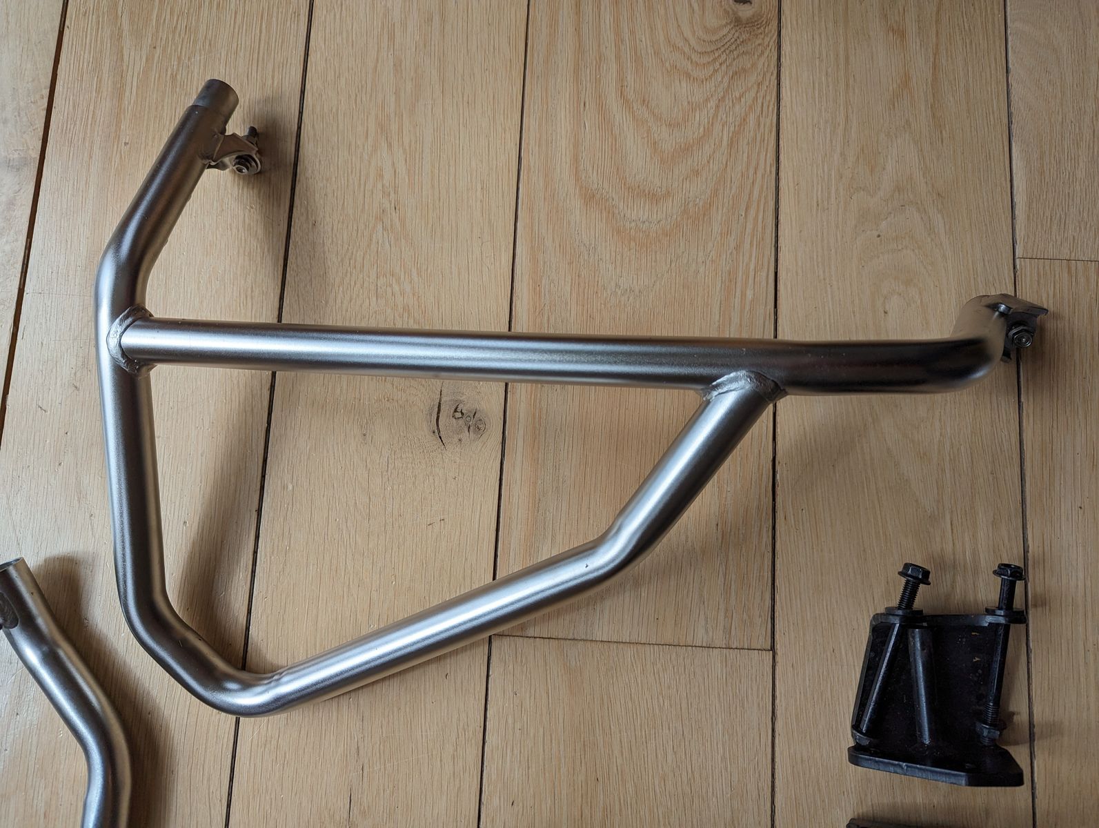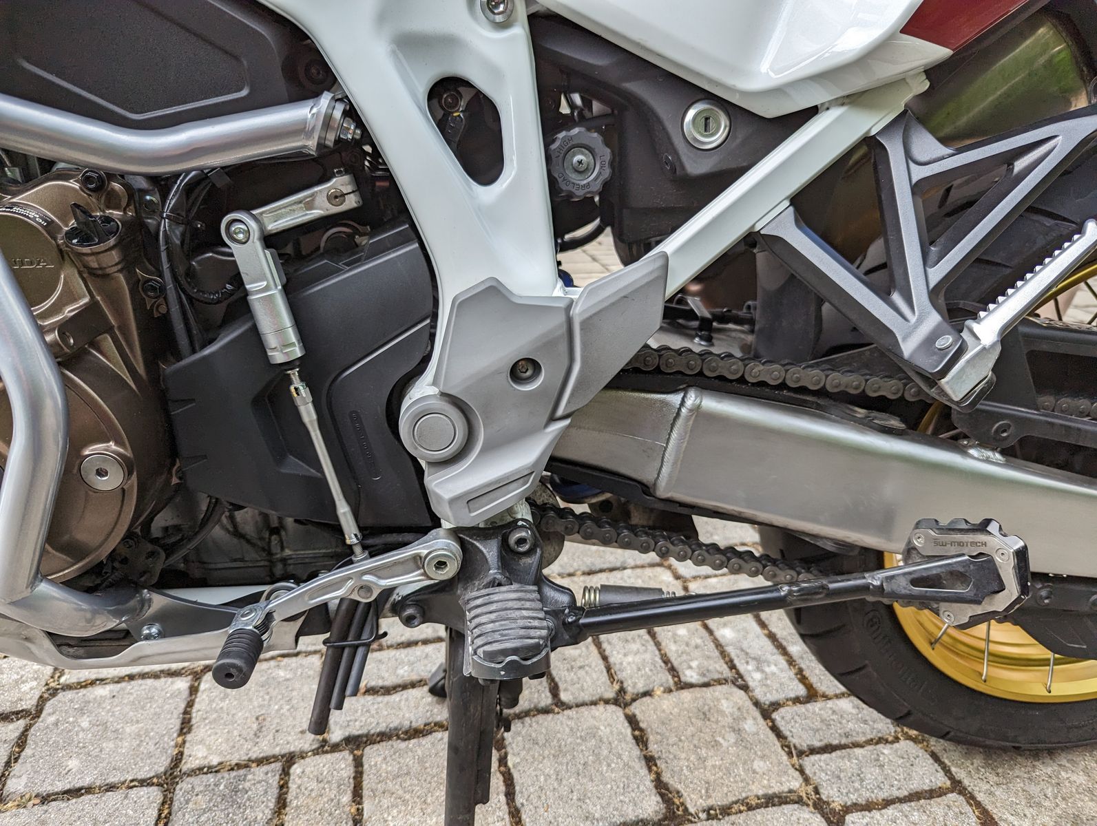 Leider hat es einen Rangierumfaller gegeben, wodurch das Hondalogo auf der linken Seite einen Sprung bekommen hat (Schlag durch Sturzbügel, siehe Foto). Der linke Sturzbügel wurde daraufhin sicherheitshalber getauscht. Ebenfalls ist dabei die Halterung des linken Handprotektors angebrochen, zu einem geplanten Tausch gegen Alubügel kam es nun nicht mehr.