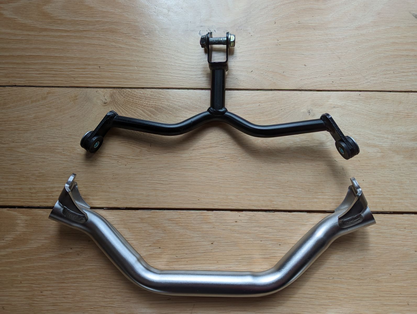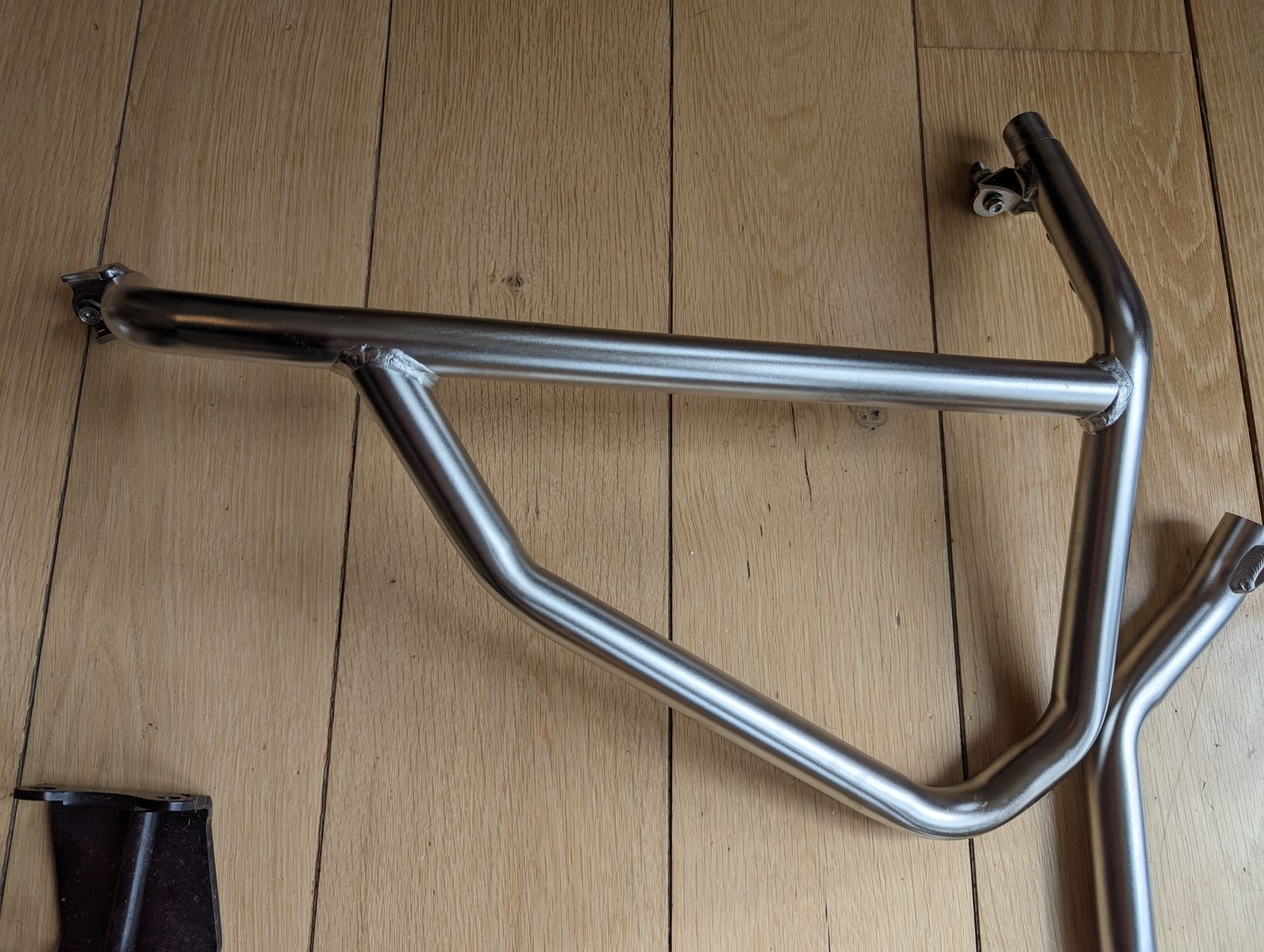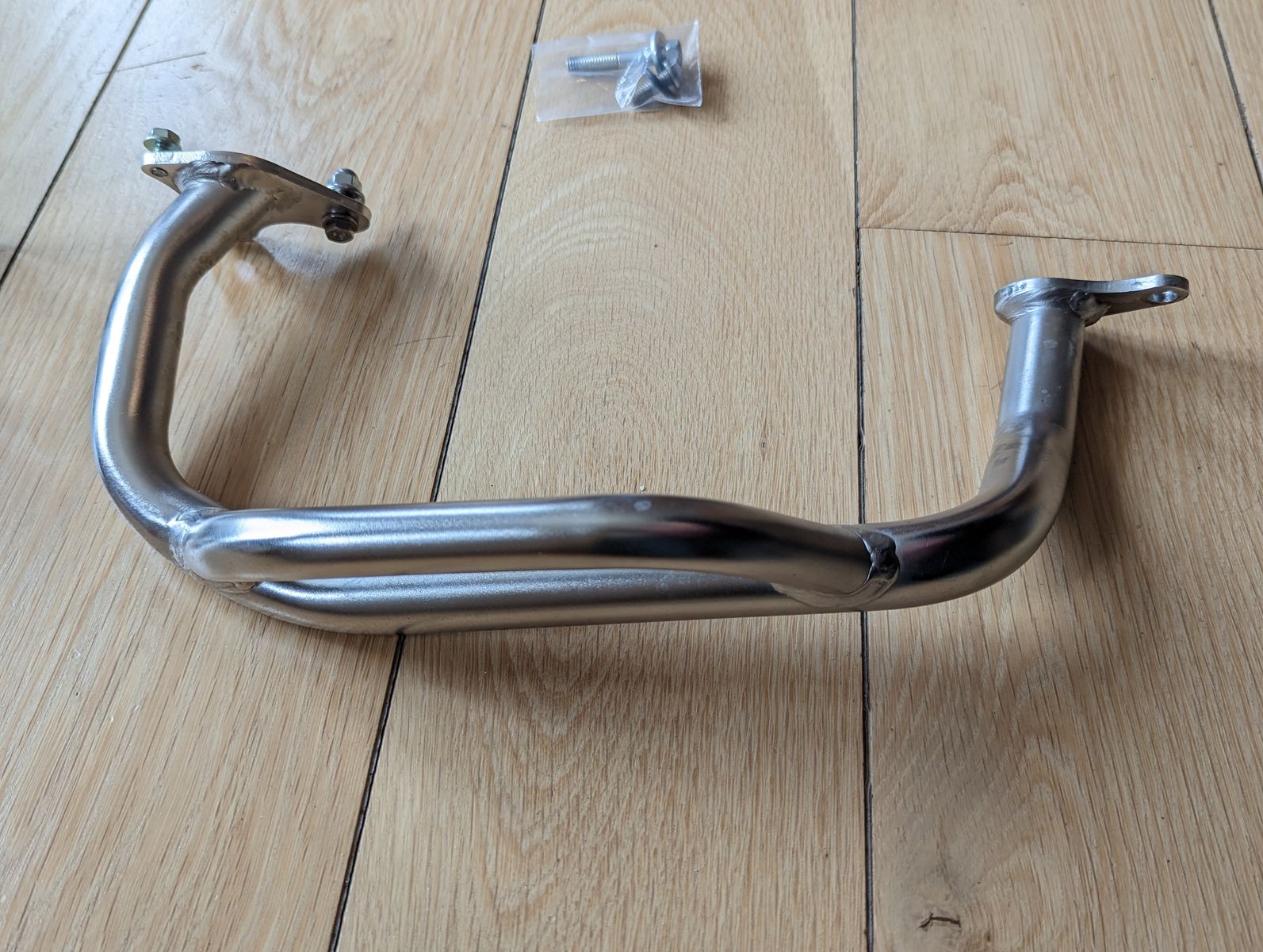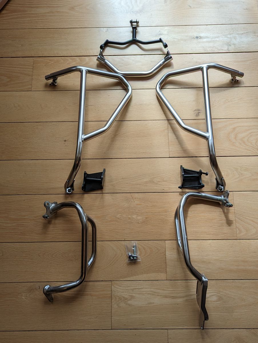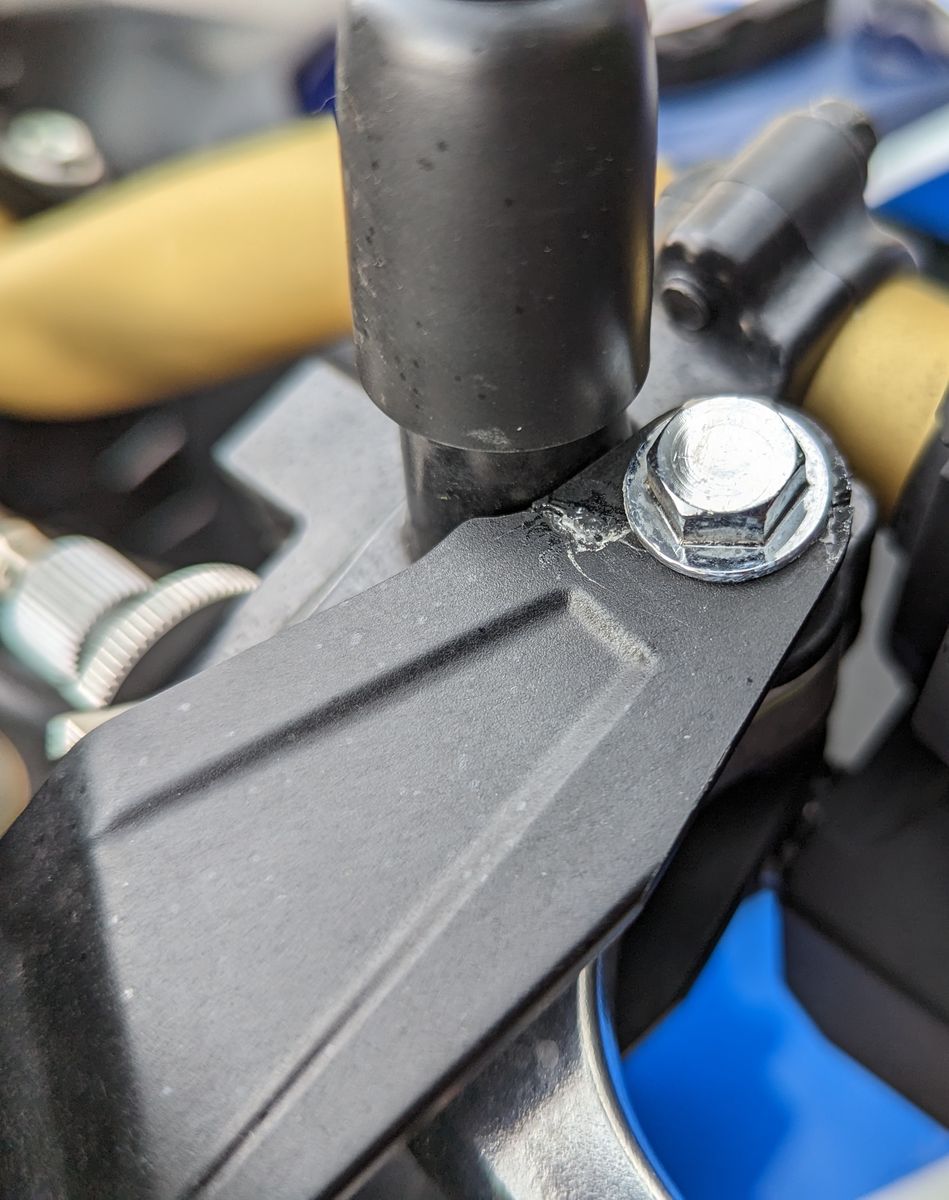 Leider hat es einen Rangierumfaller gegeben, wodurch das Hondalogo auf der linken Seite einen Sprung bekommen hat (Schlag durch Sturzbügel, siehe Foto). Der linke Sturzbügel wurde daraufhin sicherheitshalber getauscht. Ebenfalls ist dabei die Halterung des linken Handprotektors angebrochen, zu einem geplanten Tausch gegen Alubügel kam es nun nicht mehr.