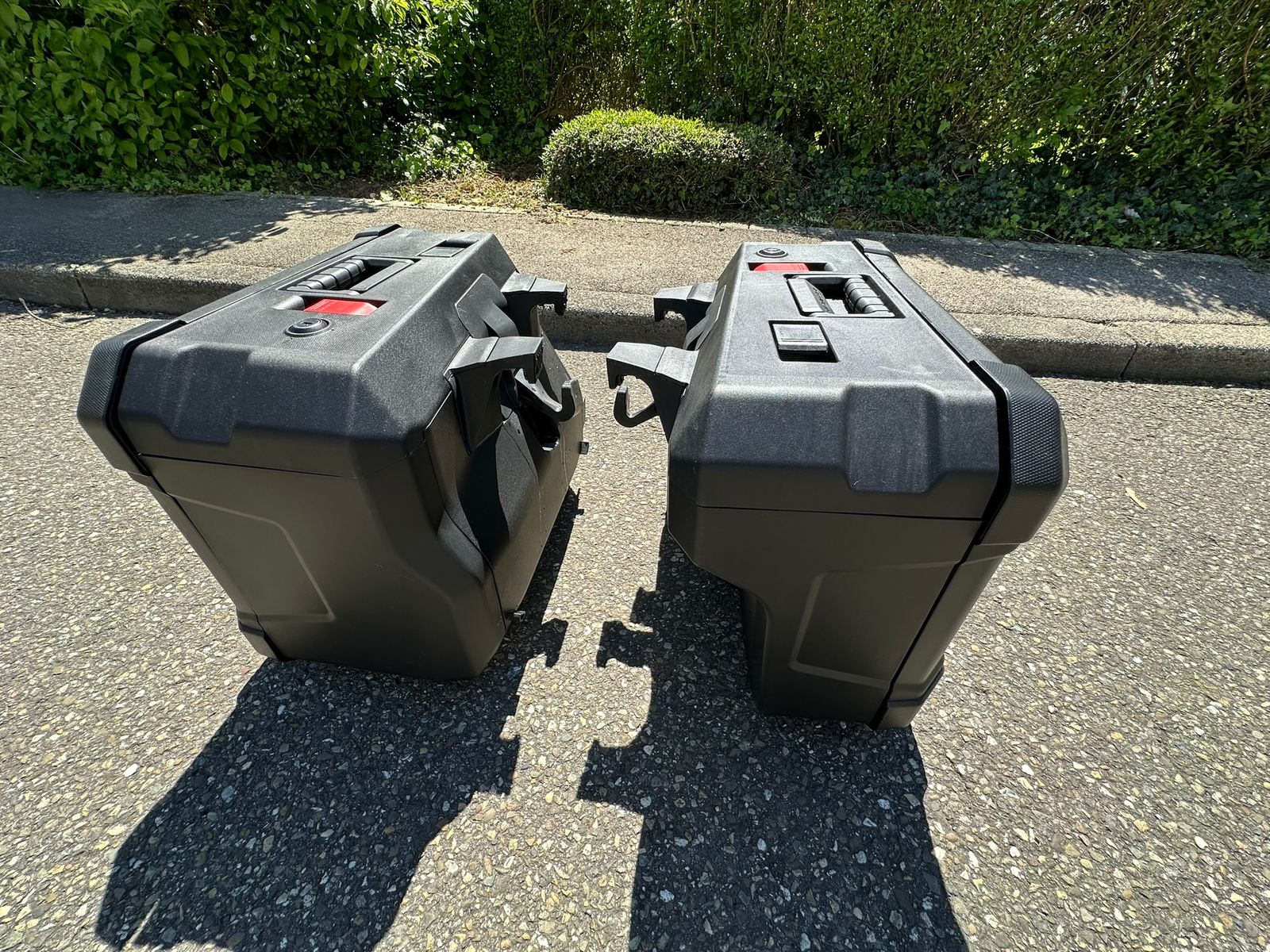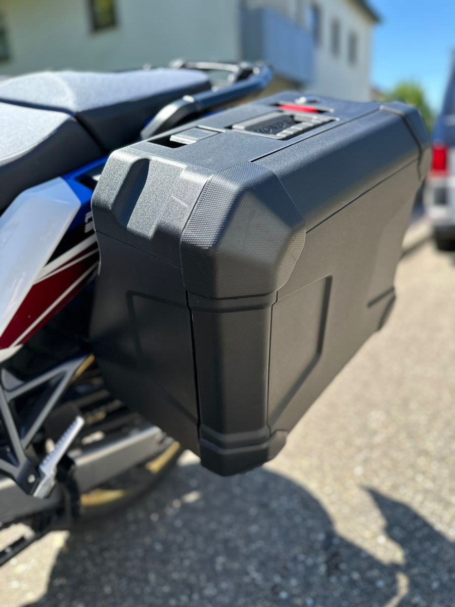 Die Lieferung war absolut problemlos und in den angekündigten 6 Wochen. Die Koffer machen einen soliden Eindruck, auch das Haltesystem wirkt mindestens so gut wie die Befestigung der Original-Kunststoffkoffer. Der Koffer sitzt solide am Bike und stützt sich wie die Originale als dritten Punkt an der Fussraste ab. Natürlich ist das kein Koffersystem fürs schwere Gelände aber für den normalen Straßen/Schottermix sehe ich keine Probleme, da wackelt nix. Fährt bis 120 absolut stabil, auf der BAB war ich noch nicht. Und wenns doch mal ins Gelände soll, sind sie in 2 Minuten spurenlos demontiert, der Verzicht auf hässliche Kofferträger gefällt mir wirklich. Kleines Manko: Der ausgeschnittene Koffer auf der Auspuffseite steht nicht, also nicht als Camping Stuhl geeignet!