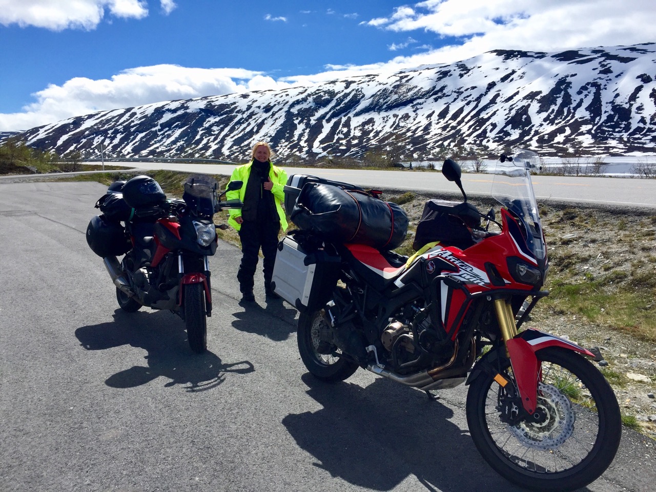 Wir waren gerade zu zweit am Nordkapp. Hatten quasi 3 Zimmer/Küche/Bad dabei und einiges an Vorräten. Jeweils dreier Koffersatz/Gepäckrolle und Tankrucksack - bzw. Andrea's Handschuhfach an der NC- fanden wir OK (ausser beim Auf- und Absteigen ![]()