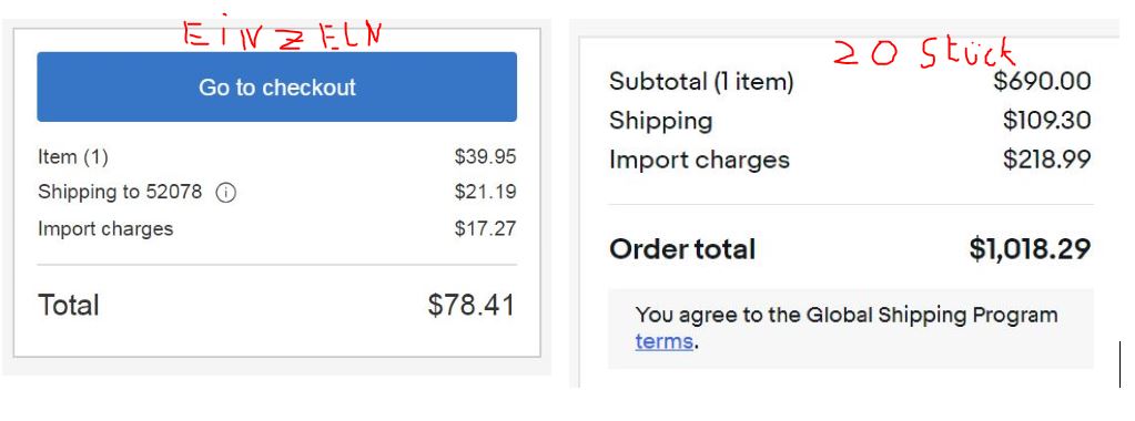 Hier kannst Du ja sehen das bei 20 Forkshield $218.99 Einfuhr Steuer direkt bei Ebay mit in den Kaufpreis eingerechnet werden (bzw $17.27 wenn man nur ein einzelnes Forkshield kauft).